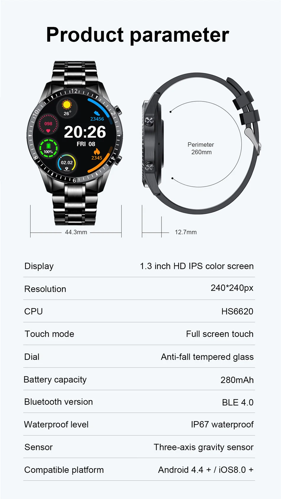 Добро пожаловать в наш магазин!Качество на первом месте + самое лучшее обслуживание.Все клиенты-наши друзья* 1,3 дюймов Цвет Полный сенсорный экран* Чип HS6620D* Сенсорный + управление боковым ключом* Встроенный аккумулятор 200 мАч, время работы в режиме ожидания 30 дней, время использования 5-7 дней* Bluetooth 4,0* Совместимость с iOS 8,4 версии выше и Android 4,4 версии выше* Водонепроницаемость IP67. (запрещено использовать его для купания.)* Мультиспортивный режим (футбол, настольный теннис, бадминтон, баскетбол, скакалка, плавание, альпинизм, Велоспорт, бег, ходьба)* Количество упражнений, время упражнений, потребление калорий* Мониторинг сердечного ритма, Мониторинг Артериального давления/кислорода в крови, мониторинг сна (время сна, качество сна)* Напоминание о звонках, SMS напоминание, напоминание о социальных приложениях (Facebook, Twitter, Line, Whatsapp, Instagram...), вызов по Bluetooth* Другие функции: напоминание о сидячем положении, напоминание о питьевой воде, будильник, удаленная камера, отсчет, Поиск телефона, поднимите запястье на светильник, переключитесь между несколькими циферблатамиЯзыки часов: английский, русский, французский, польский, испанский, португальскийПоддерживаемые приложения Языки: японский, корейский, немецкий, английский, русский, французский, польский, испанский, португальский, голландский, арабский.1 * умные часы1 * зарядное устройство1 * Руководство пользователя1 * Розничная коробкаПримечание:Носимые устройства отслеживают деятельность человека с помощью электронных датчиков, и они находятся на уровне электуоники потребителя. Это нормально для определенного отклонения. Пользователь должен рассматривать данные объективно.-Пожалуйста, не сравнивайте с больничным оборудованием для чтения, это не медицинское устройство!-- Перед использованием отсканируйте qr-код в руководстве, чтобы загрузить приложение и подключить его к часам с помощью приложения.-Для пользователя Android: пожалуйста, всегда разрешайте доступ приложения ко всем функциям телефона и Всегда позволяйте ему работать. И, пожалуйста, включите GPS на вашем телефоне, прежде чем подключить его.-Пожалуйста, заряжайте его в течение 2-3 часов после получения. После длительной доставки у него не было электричества. Спасибо!