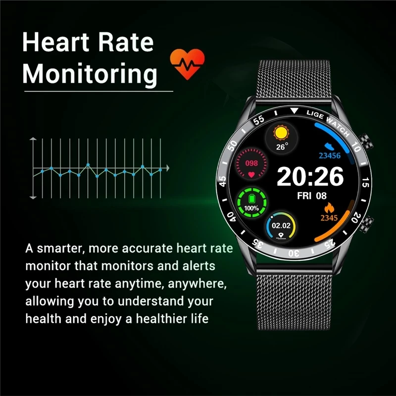 Смарт-часы мужские с круглым сенсорным экраном, Bluetooth, шагомером и Пульсометром