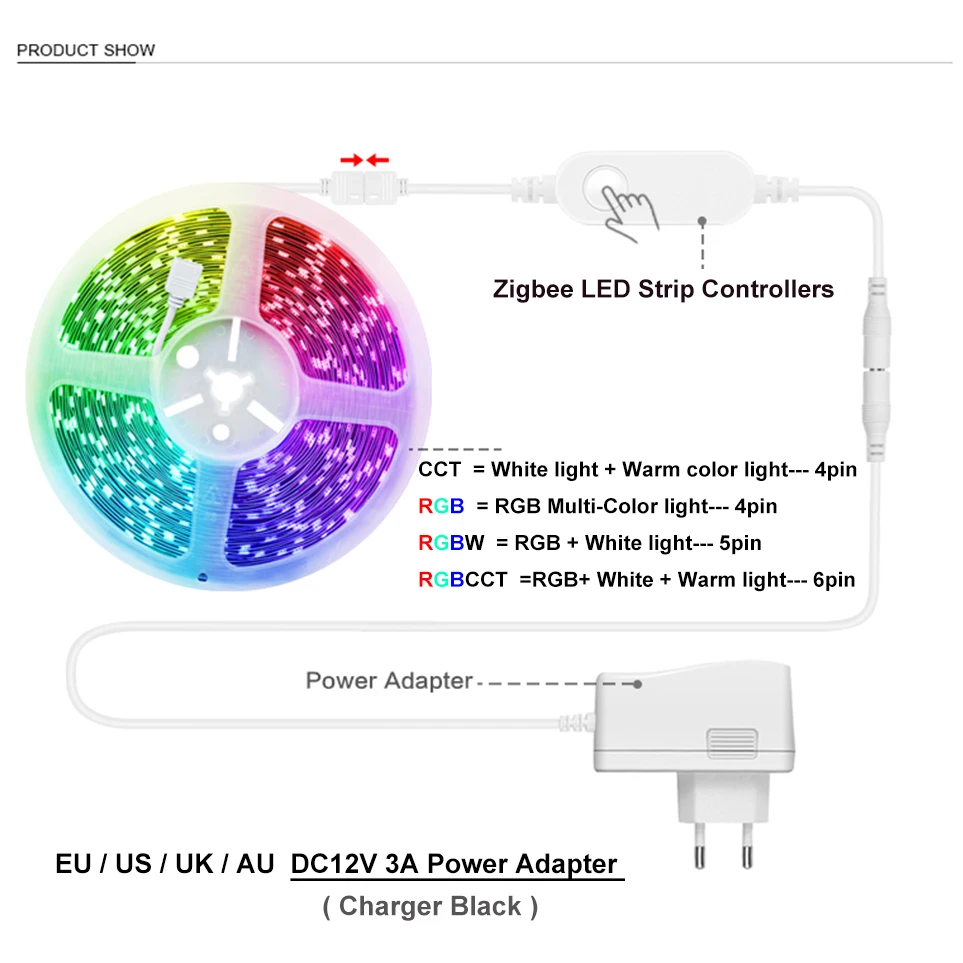Светодиодная лента 5 М 5050-1 шт.Мини-контроллер zigbee-1 шт.1 x 3A адаптер питания для ЕС/Великобритании/США/Австралии (мы выбираем вилку для отправки в соответствии с вашей страной)