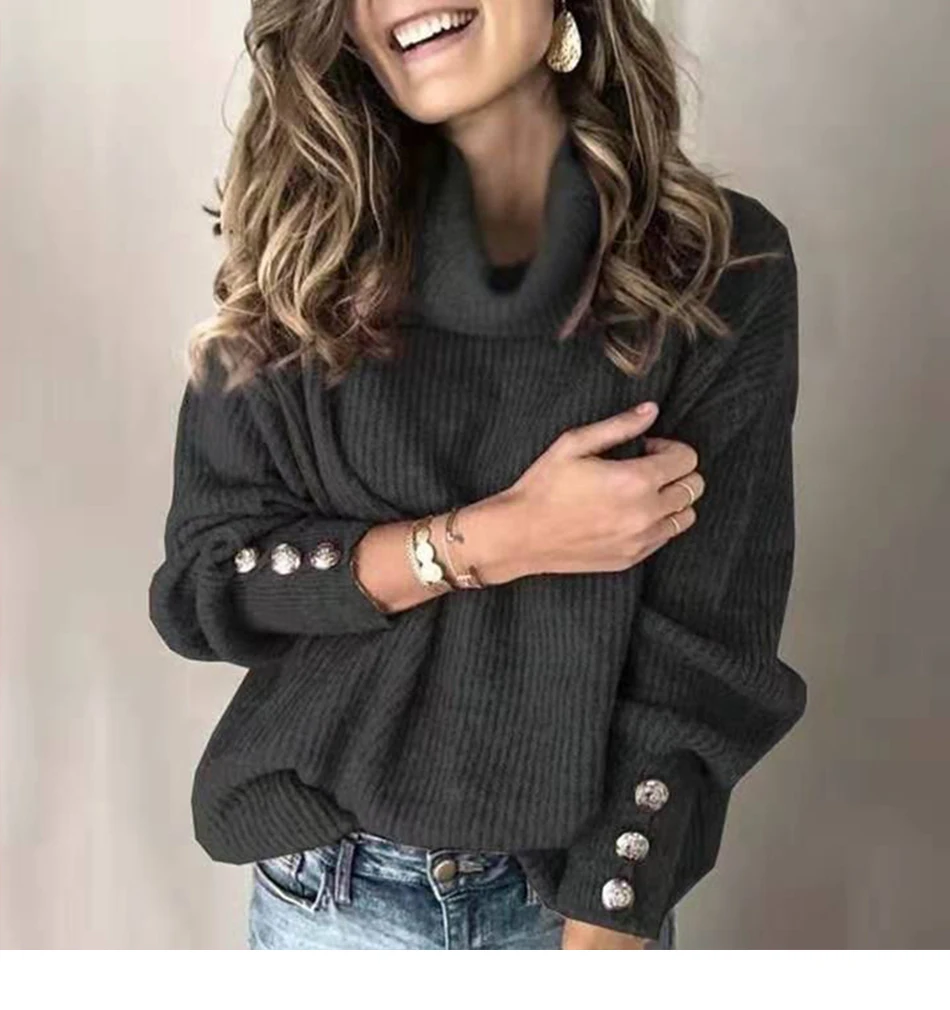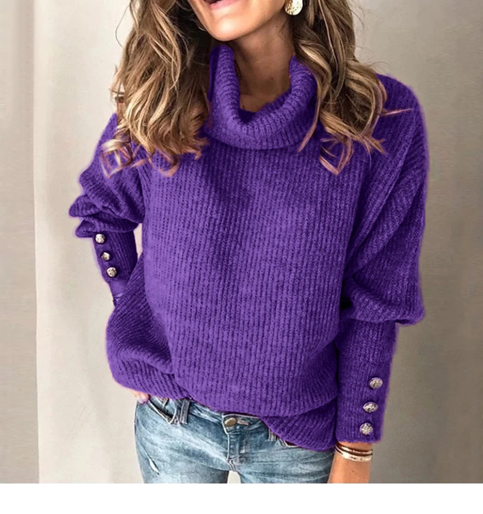 Женский пуловер-водолазка на пуговицах, Свободный вязаный свитер с ...