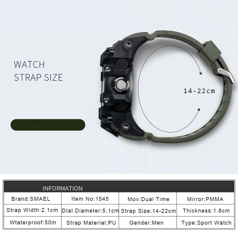 Описание товара:1. Бренд: SMAEL2. Двойное Отображение времени с функцией светодиодный подсветки3. Водонепроницаемость 50 м4. Тип: мужские спортивные часы5. Движение: оригинальный японский цифровой механизм6. 16 цветов на выбор8.-ширина ремешка: Ширина: (приблизительно) 2,1 см9. Циферблат Диаметр: (приблизительно) 4,8 см10. Материал ремешка: прочная искусственная кожа11. Материал корпуса: прочная резина + Высокопрочное закалённое стекло12. Застежка: Пряжка13. Точное отображение времени14. Это хороший подарок для кого-то особенногоПримечание: Мы рекомендуем не носить его во время плавания. Но если вы идете плавать или нырять, пожалуйста, не нажимайте кнопки под водой!Компоненты в комплекте:-1 x оригинальные часы SMAEL-Руководство по эксплуатации-1 шт.