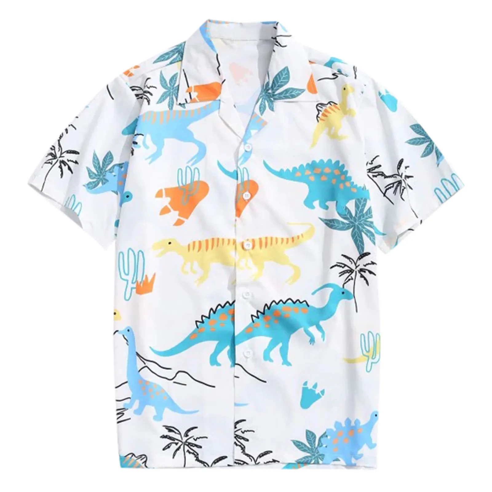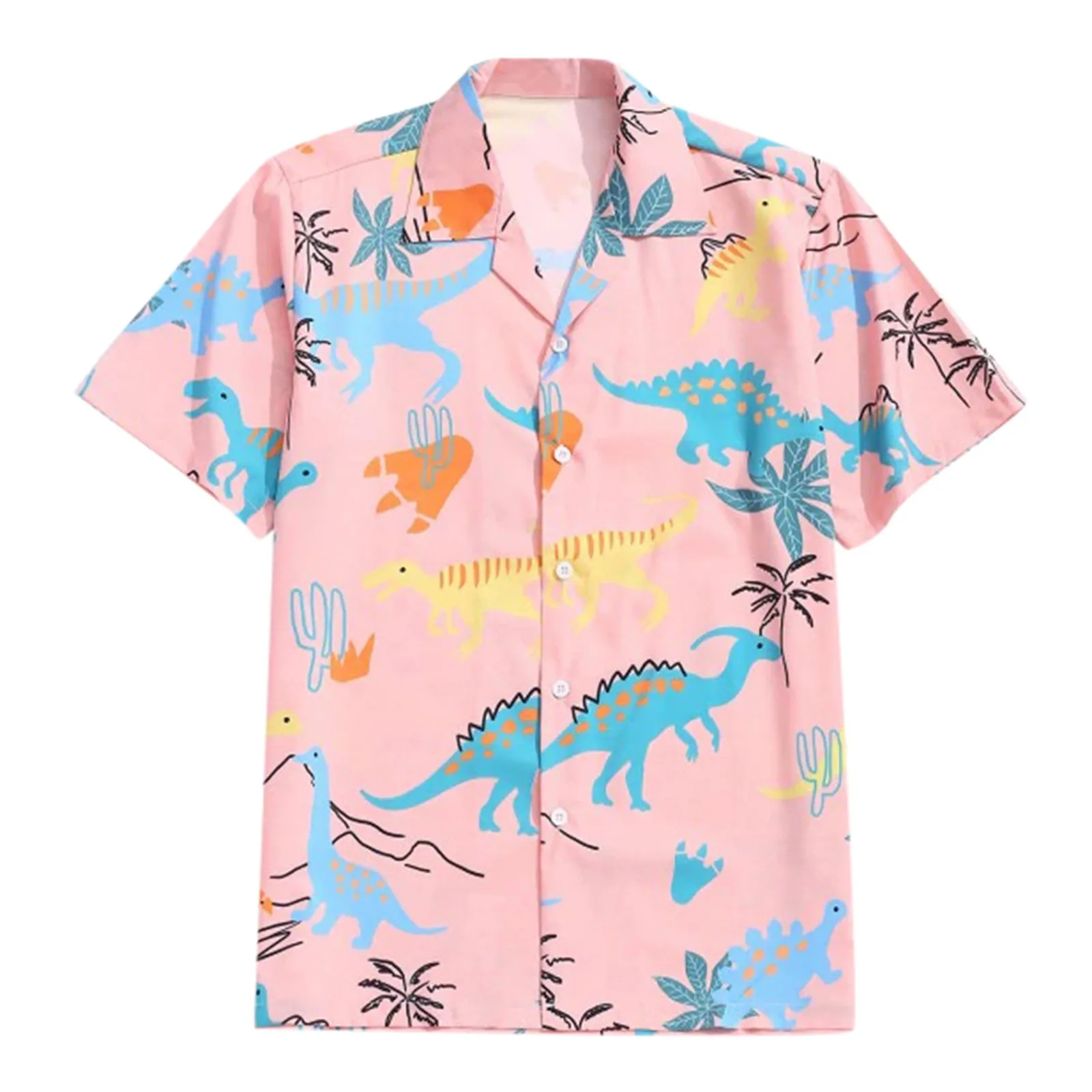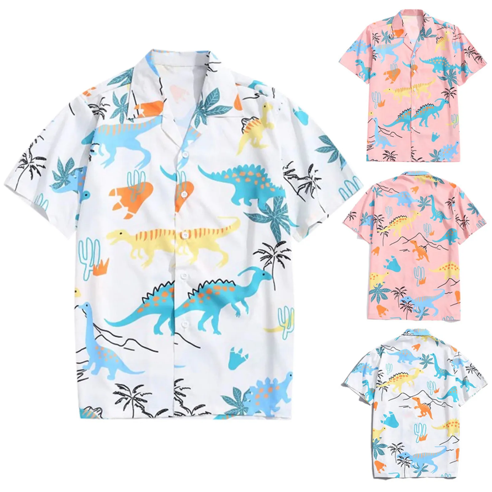 Гавайская рубашка мужская с коротким рукавом, смешной мультяшный принт динозавра, отложной воротник, одежда в Корейском стиле для отпуска