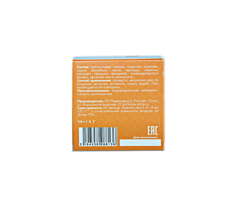 Состав: кокосульфат натрия, гидролат облепихи, маслооблепихи,масло авокадо,