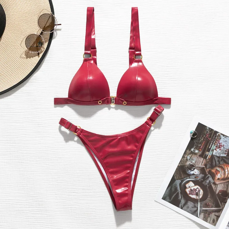 ПУ кожаное бикини набор красный купальник треугольничками женский купальник женский 2020 модные летние высокий разрез женские купальник женский сексуальный купальный костюм