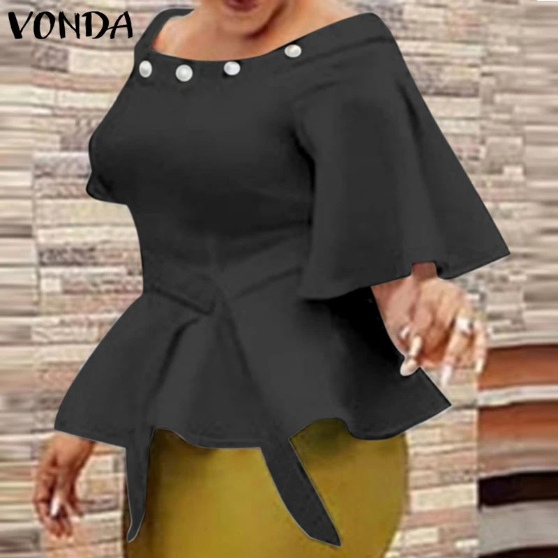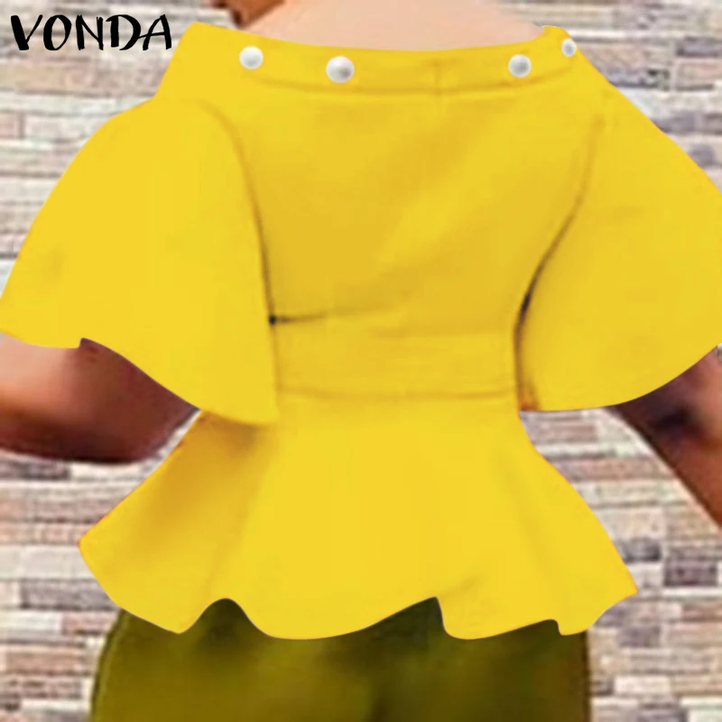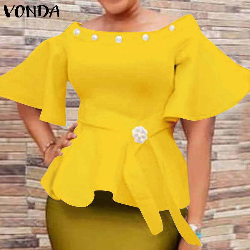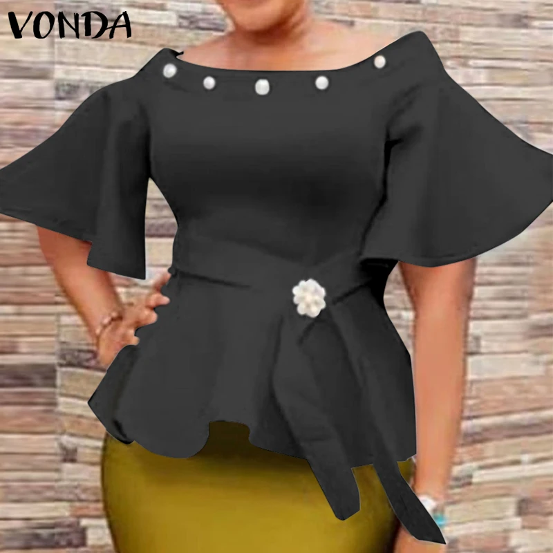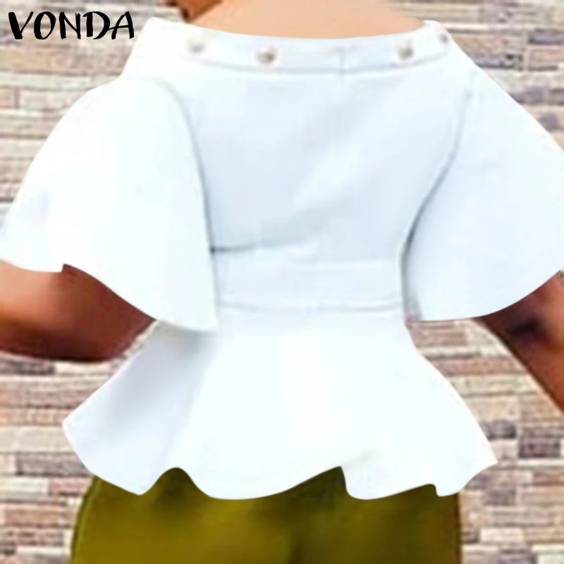 2021 женские топы VONDA, расклешенная Блузка с поясом и оборками, богемные блузы, женские летние офисные рубашки с коротким рукавом