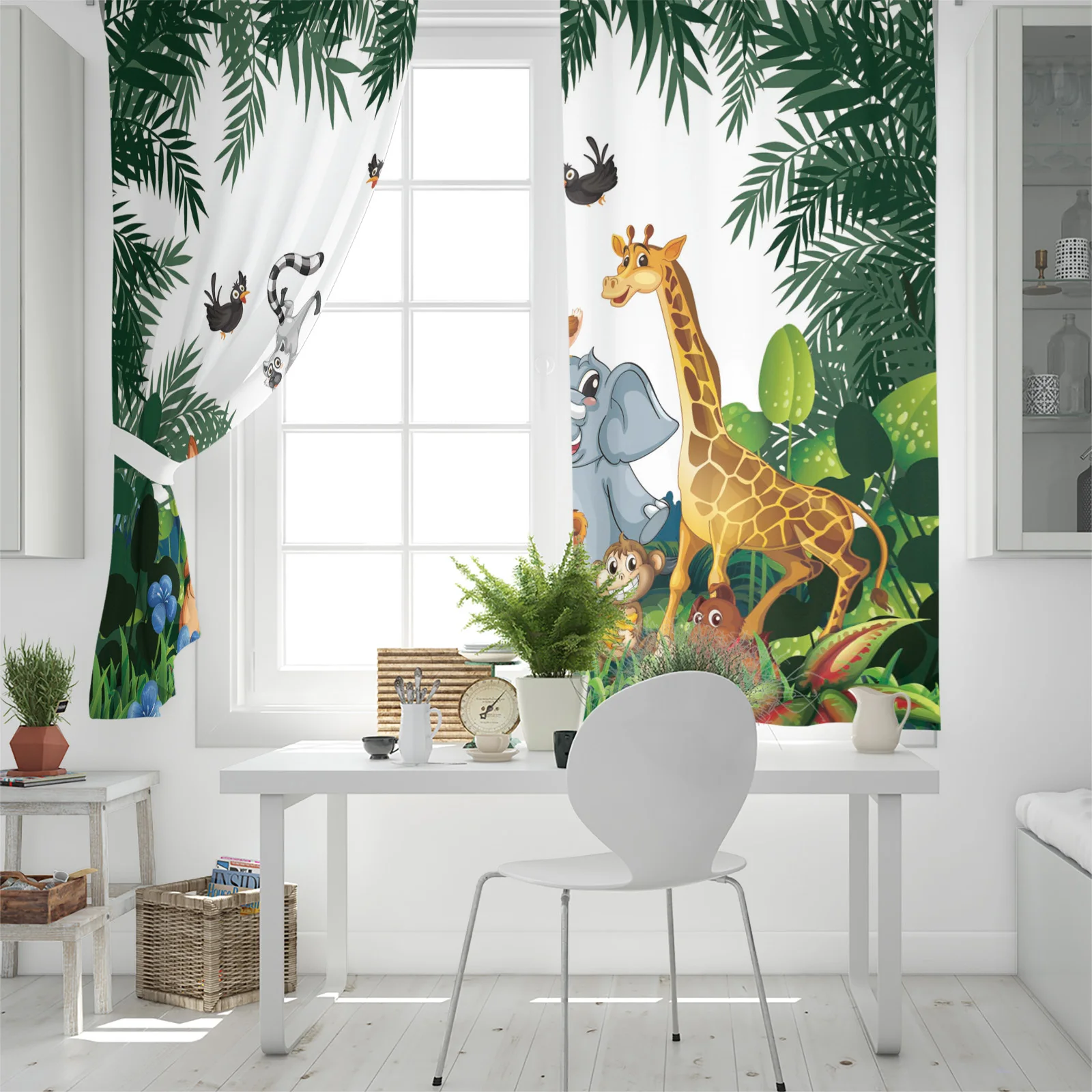 Занавески на окна с изображением животных, птиц, тропических цветов...