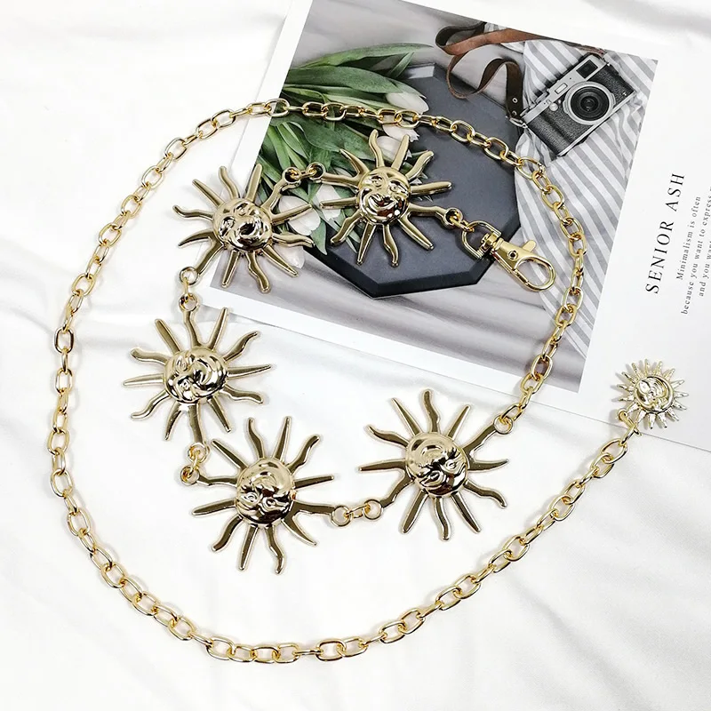 Ремень с золотой цепочкой Женский, металлический пояс в виде Луны и солнца для женщин, пояс в стиле панк для платьев, в готическом стиле, длинный пояс для кеттинга