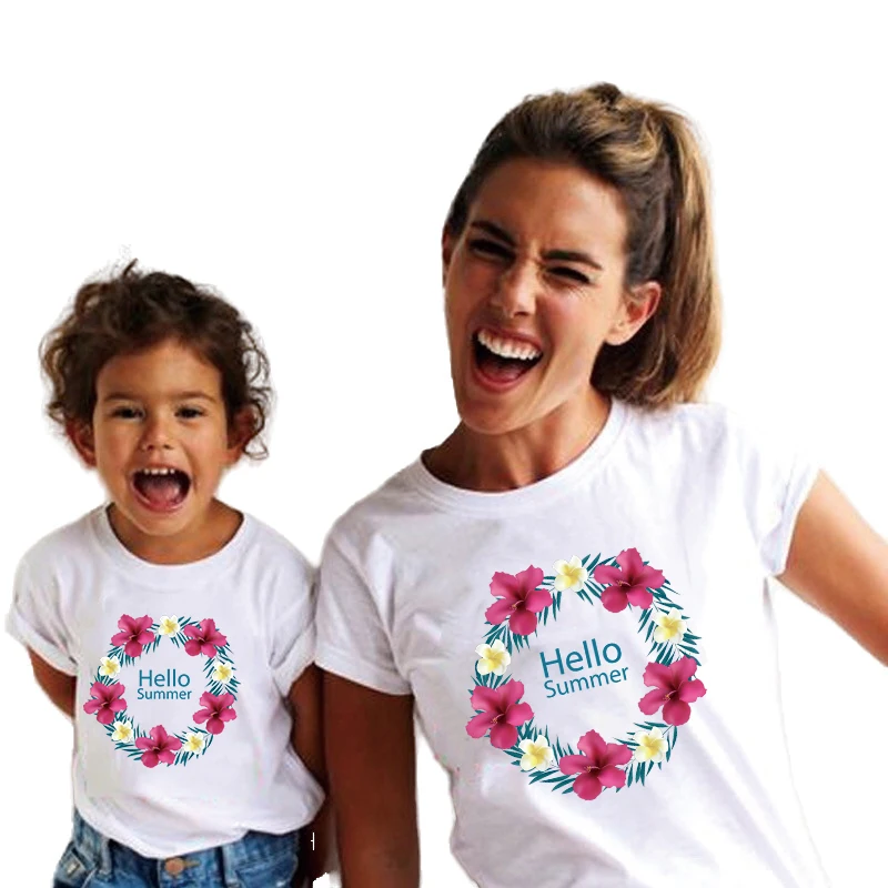 Одинаковые комплекты для мамы и дочки одежда для семьи летняя футболка для девочек-подростков Белая Летняя футболка с короткими рукавами из 100 хлопка «Hello» боди для малышей