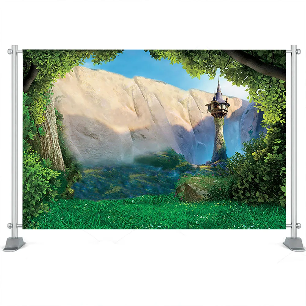 Фон для детской фотосъемки с изображением сказочной долины, леса, зеленой травы, пола, горы, голубого неба