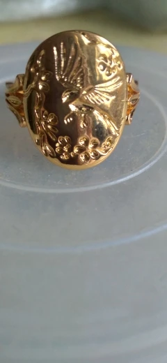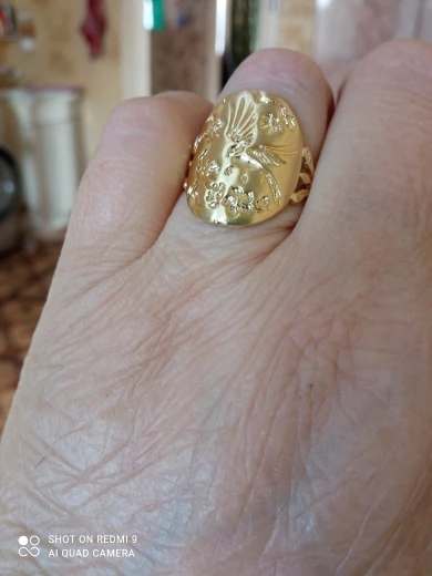Кольцо женское золотистого цвета с выгравированным цветком и птицами