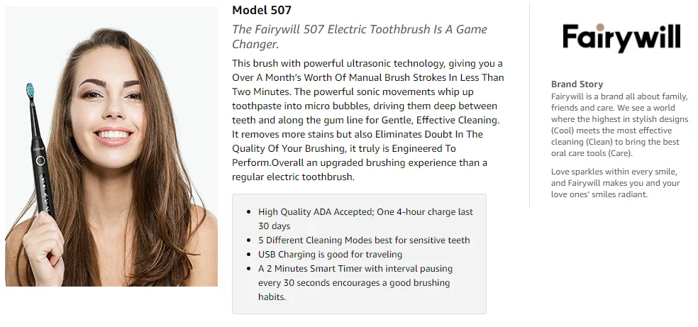 Совет ADA по приему Scientific Affairs звуковой электрической зубной щетки Fairywill 507 основан на его выводе о том, что продукт безопасен и демонстрирует эффективность в удалении зубного налета и помогает предотвратить и уменьшить гингивит, при использовании в соответствии с направлениями.