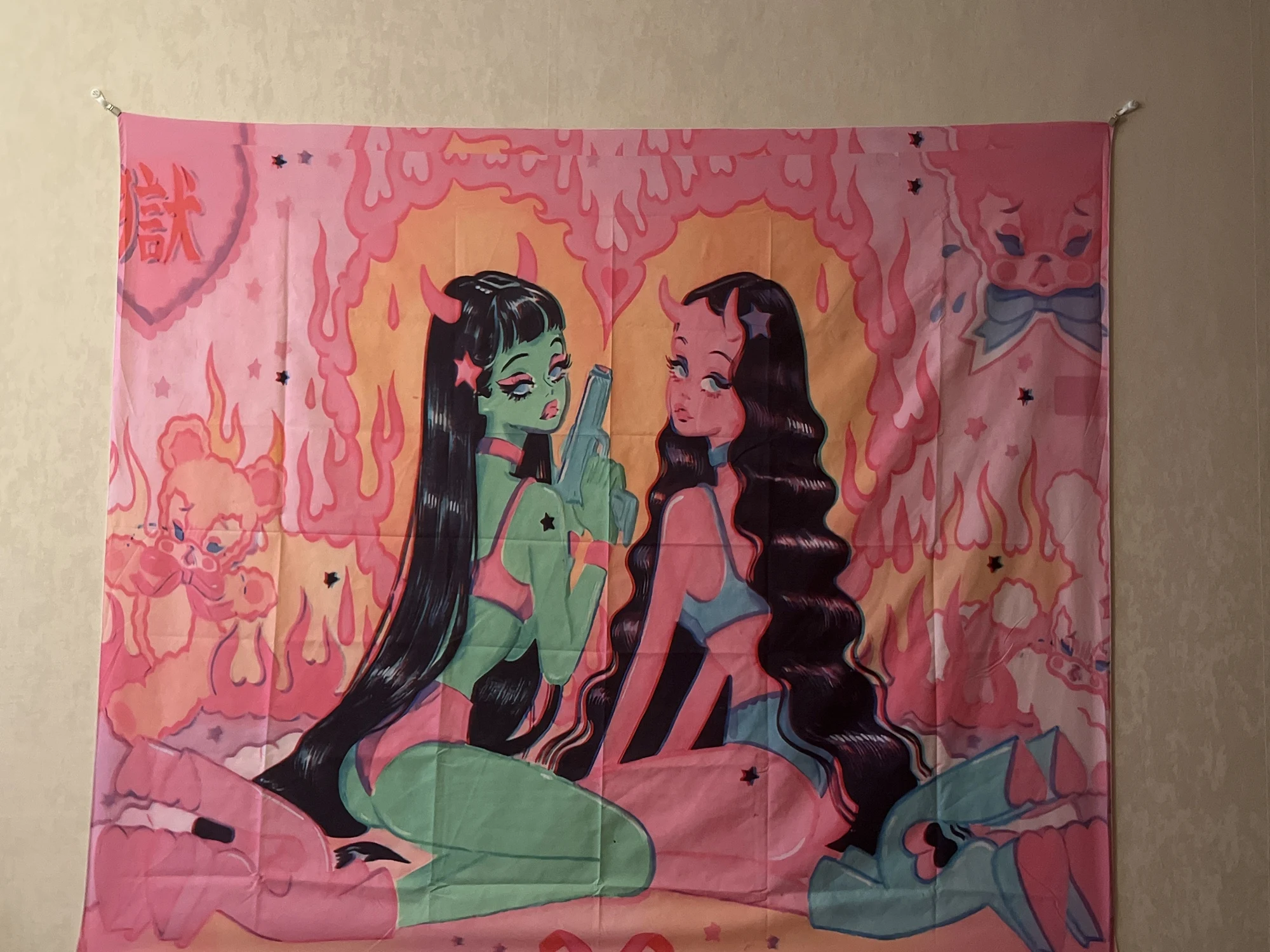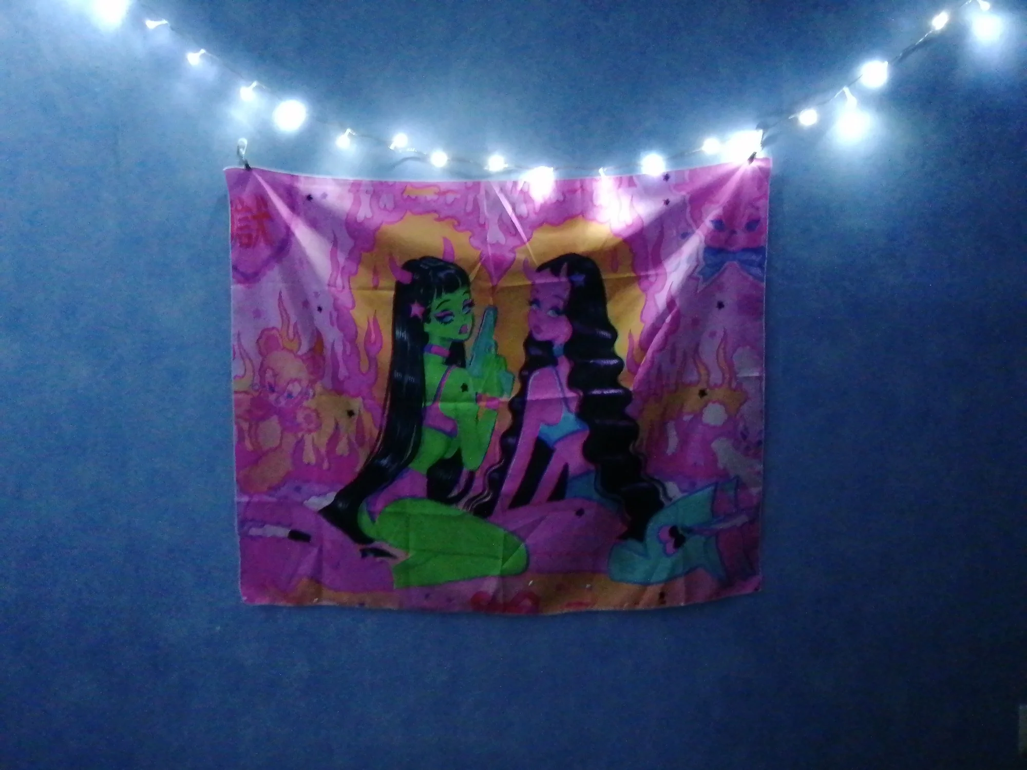 гобелен безумно милый и качественный! также в комплект положили крепление(?), но увы я не могу понять как оно работает, так что буду крепить на двухсторонний скотч, цветопередача и качество принта хорошее, берите, не пожалеете!