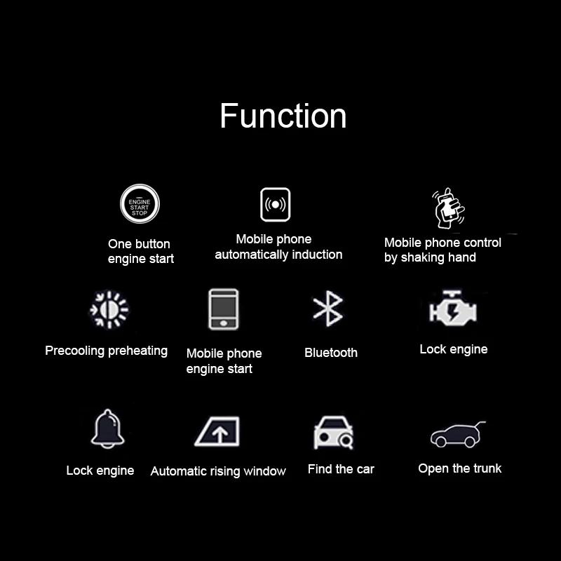 Особенности продукта:1. Автоматическая блокировка/разблокировка мобильный телефон2. Кнопка блокировки/разблокировки телефона3. Откройте функцию задней коробки (она может работать только в том случае, если задний ящик автомобиля питается от электричества)4. Ищите навыки автомобиля5. Антикражная вибрация6. Заблокируйте свой автомобиль7. Пульт дистанционного управления для запуска/остановки автомобиля8. Функция пуска одной кнопки9. Функция блокировкиПрименимые модели:1. Подходит для автомобилей 12 В2. Не подходит для моделей Buick, Mercedes-Benz, BMW, Volkswagen и других моделей высокого класса, другие модели могут быть установленыПримечание:1. Выход продукта по умолчанию является отрицательным полюсом при выходе из фабрики. Если автомобиль имеет положительный полюсный выход, необходимо установить два реле 12 В, чтобы он мог нормально работать.2. Пульт дистанционного управления этого продукта не содержит батарей. Пожалуйста, покупайте самостоятельно3. Если у оригинального автомобиля есть кнопка пуска одной кнопкой, его необходимо заменить на нашу кнопку пуска перед операцией.
