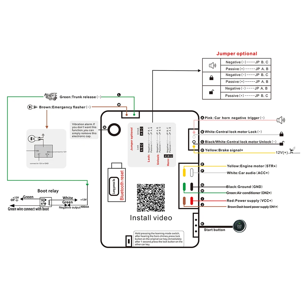 Особенности продукта:1. Автоматическая блокировка/разблокировка мобильный телефон2. Кнопка блокировки/разблокировки телефона3. Откройте функцию задней коробки (она может работать только в том случае, если задний ящик автомобиля питается от электричества)4. Ищите навыки автомобиля5. Антикражная вибрация6. Заблокируйте свой автомобиль7. Пульт дистанционного управления для запуска/остановки автомобиля8. Функция пуска одной кнопки9. Функция блокировкиПрименимые модели:1. Подходит для автомобилей 12 В2. Не подходит для моделей Buick, Mercedes-Benz, BMW, Volkswagen и других моделей высокого класса, другие модели могут быть установленыПримечание:1. Выход продукта по умолчанию является отрицательным полюсом при выходе из фабрики. Если автомобиль имеет положительный полюсный выход, необходимо установить два реле 12 В, чтобы он мог нормально работать.2. Пульт дистанционного управления этого продукта не содержит батарей. Пожалуйста, покупайте самостоятельно3. Если у оригинального автомобиля есть кнопка пуска одной кнопкой, его необходимо заменить на нашу кнопку пуска перед операцией.