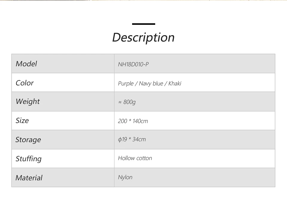Бренд: NaturehikeНазвание: одеяло для ношения на открытом воздухеТкань: нейлонЦвет: фиолетовый/хаки/синий/желтый/серыйРазмер: 200*140 смРазмер упаковки: 19*34 смВес нетто: 800 г