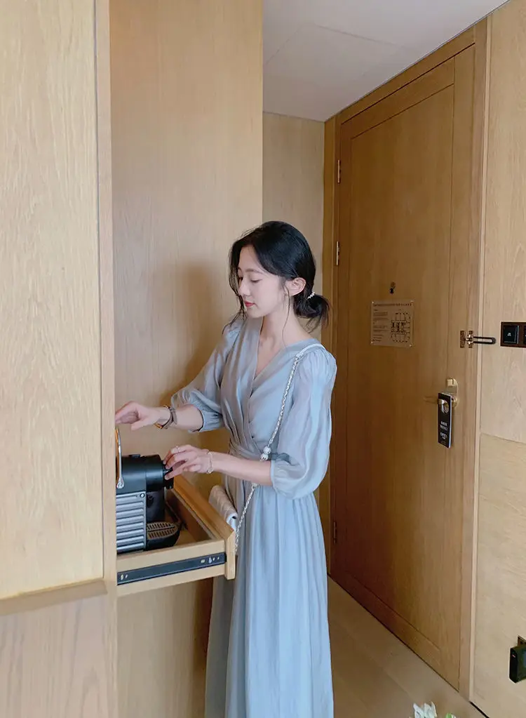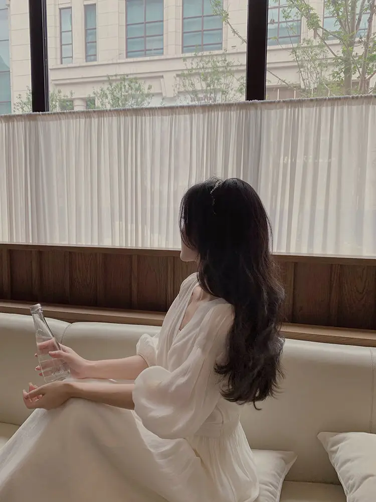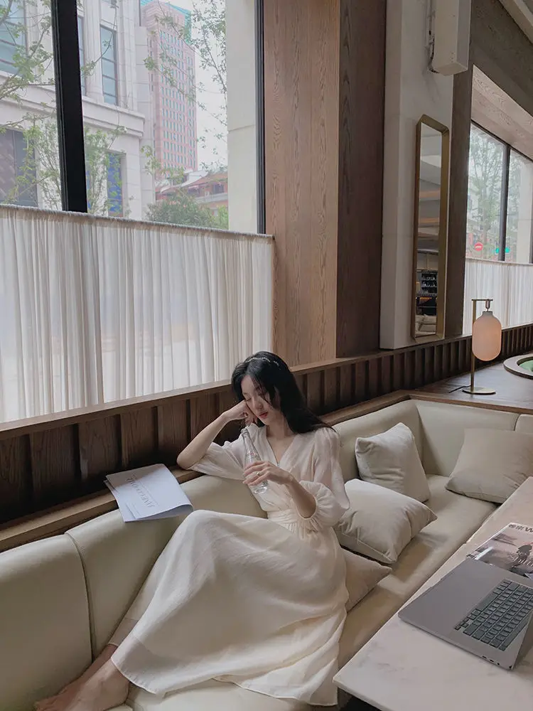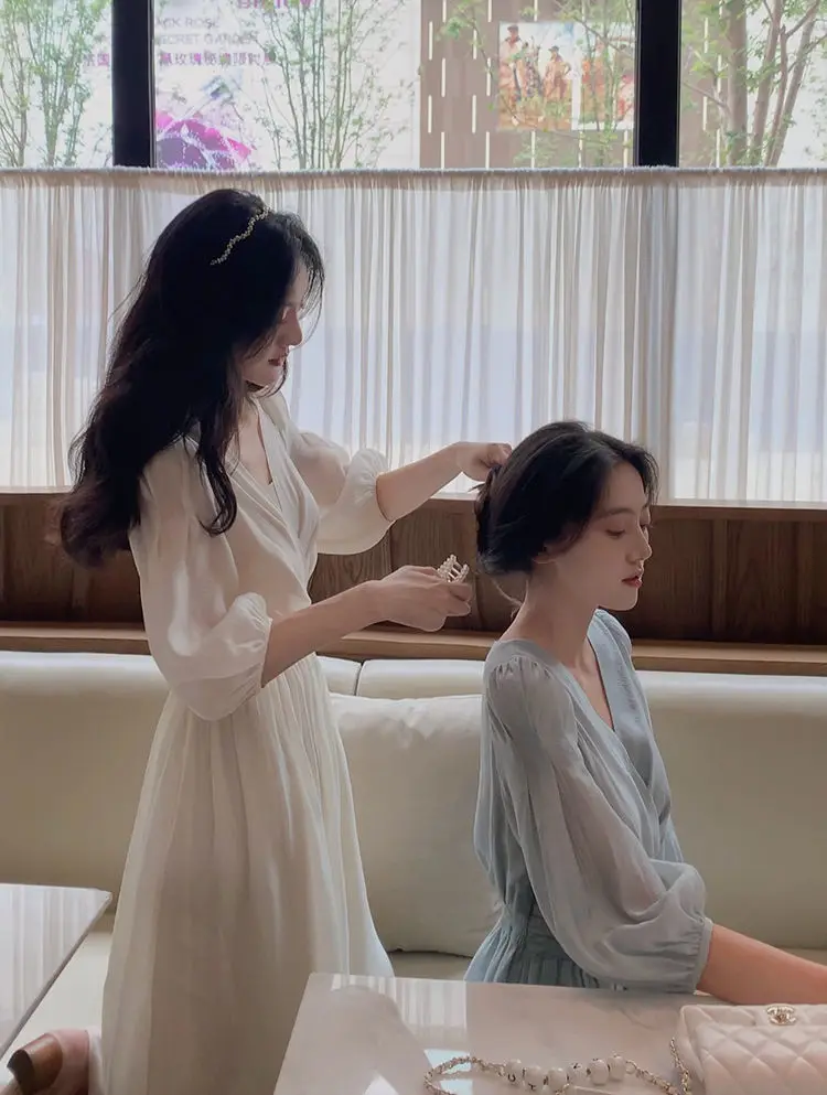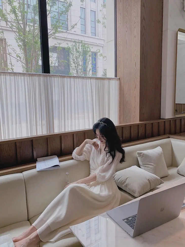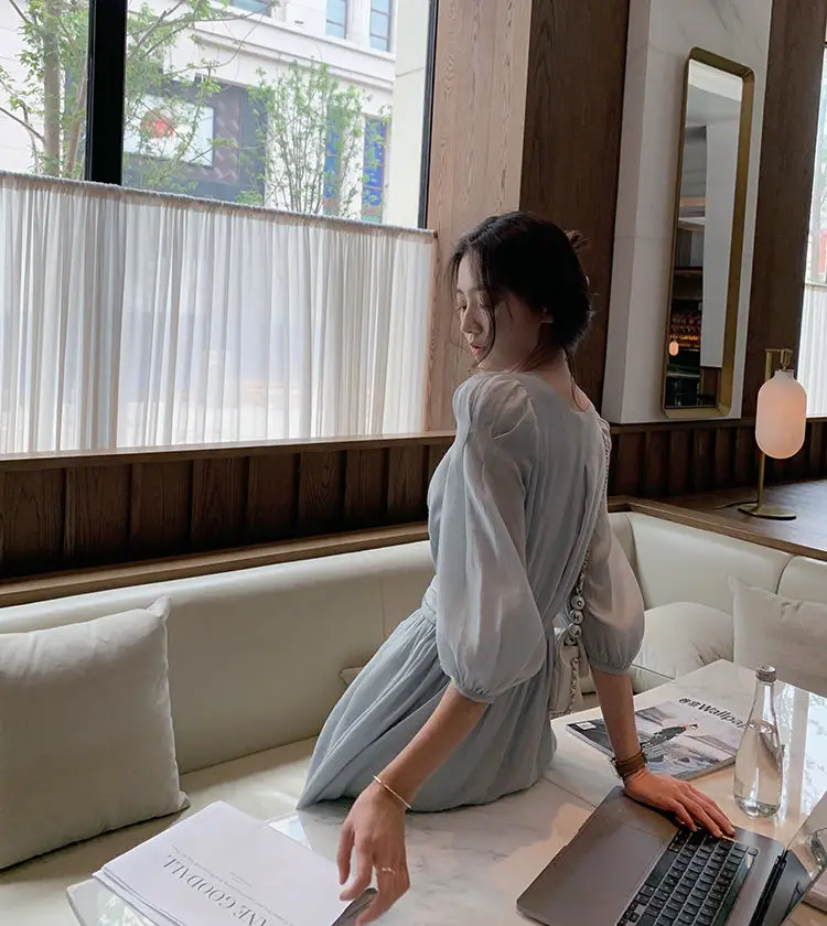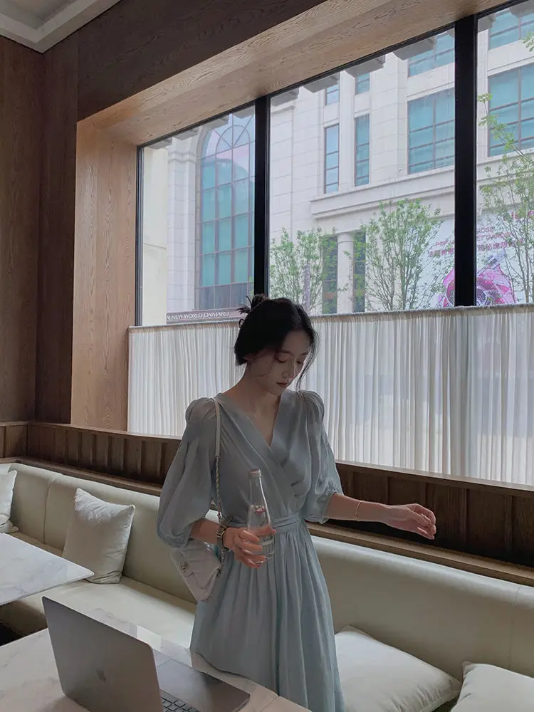 Женское шифоновое платье с пышными рукавами, Элегантное повседневное платье во французском ретро-стиле, офисное сказочное платье с V-образным вырезом, лето 2021