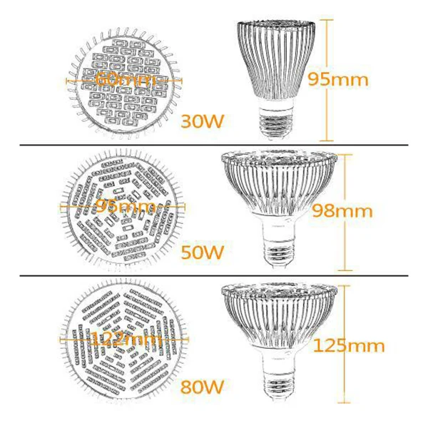 Характеристика:Энергосбережение с более высокой эффективностью. 1 Вт Светодиодный, может заменить 3,5 Вт HPS,HID,MH, лампы накаливания и галогенные лампы450nmBlue ускоряет выращивание листьев и Выращивание растений650nmRed является ключом к продвижению цветения и роста растенийУФ-Функция: стерилизация, убивает бактерии, которые серьезно влияют на цветение и рост растений.ИК-Функция: стимулирование деления клеток и цветение и Вег, увеличение урожайности в определенной степени.Идеально подходит для небольших коробок для выращивания, палаток для выращивания, Гидропоники DIY, бонсай, сада и т. д.Удобные, гуманистические и высокоэффективные. Этот парниковый светильникМожет покрывать больше видов растений, которые нуждаются в более сильном освещении, также лучшеДля периода цветов и фруктов из-за более красной длины волны.Этот гидропонный светодиодный светильник для выращивания может быстро улучшить здоровье растенийИ растет, как правило, больше листьев появляется в течение 2 недель использованияЭта растущая лампа на ежедневной основе.Этот светодиодный светильник для выращивания растений предназначен для соответствия стандарту E27Розетка, легко устанавливается и используется-не требуется специальная лампа, настольная лампаБуду делать. Светодиоды имеют низкое энергопотребление, высокую светоотдачу иДлительный срок службы, Электроника Внутри понижает напряжение.Внешняя часть изготовлена в чистом виде, не пропускает теплоГенерирует любое заметное тепло даже 17 часов в день. Сохранение температурыВниз идеально.Спецификация:Артикул: 8 Вт E27 светодиодная лампа для выращивания растенийВходное напряжение: AC85V-265VУгол луча: 180 градусовСветильник источник: 640lmТемпература тела: <60 дегкСветодиодный температурный режим работы: <65 degCСрок службы:> 50000 часовСветильник: 12 красный + 4 синий + 1 белый + 1 желтыйРазмер: 50x63 ммПроект: 10 Вт E27 Светодиодный Вегетативный светильникВходное напряжение: AC85V-265VУгол луча: 180 градусовТемпература тела: <60 дегкСветодиодный температурный режим работы: <65 degCСрок службы:> 50000 часовЦвет: 15красный + 7 синий + 2 белый + 2 желтый + 2IR + 2UVРазмер: 50x63 ммАртикул: 30 Вт E27 Светодиодная лампа для выращивания растенийВходное напряжение: AC85V-265VУгол луча: 180 градусовТемпература тела: <60 дегкСветодиодный температурный режим работы: <65 degCСрок службы:> 50000 часовСветильник Цвет: 22 шт. красный + 12 шт. синий + 2UV + 2IR + 2 белыхРазмер: 60x95 ммАртикул: 50 Вт E27 светодиодная лампа для выращивания растенийВходное напряжение: AC85V-265VУгол луча: 180 градусовТемпература тела: <60 дегкСветодиодный температурный режим работы: <65 degCСрок службы:> 50000 часовЦвет: 42 шт. красный + 12 шт. синий + 6UV + 6IR + 6 белыйРазмер: 95x98 ммАртикул: 80 Вт E27 светодиодная лампа для выращивания растенийВходное напряжение: AC85V-265VКрасный, зеленый, синий) Угол пучка: 90 / 120 градусов смешиванияТемпература тела: <60 дегкСветодиодный температурный режим работы: <65 degCСрок службы:> 50000 часовЦвет: 78 шт. красный + 24 шт. синий + 6UV + 6IR + 6 белыйРазмер: 122x125 мм