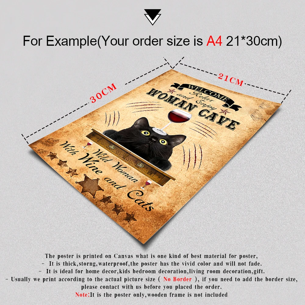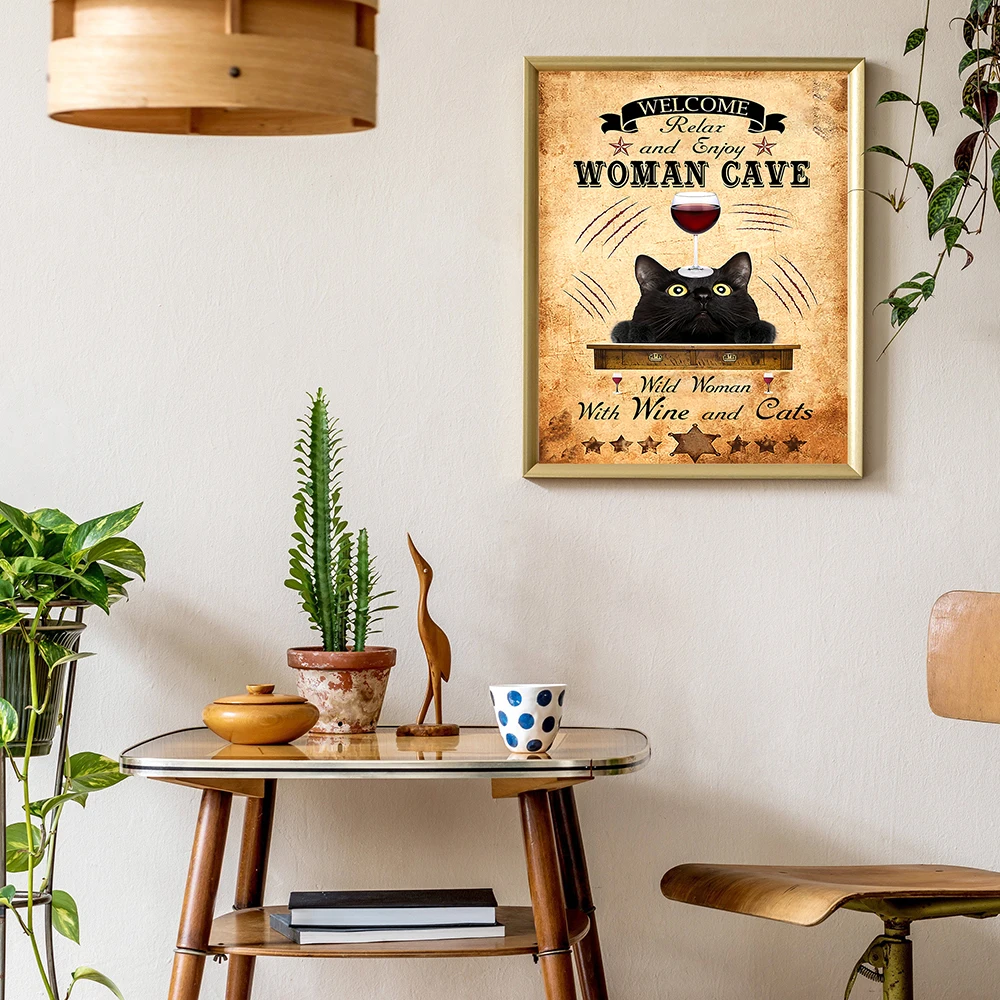 Черный кот женщина пещера постер кошка напиток красное вино художественный принт Винтаж получить Ретро Забавный знак для ванной Холст Картина домашний декор