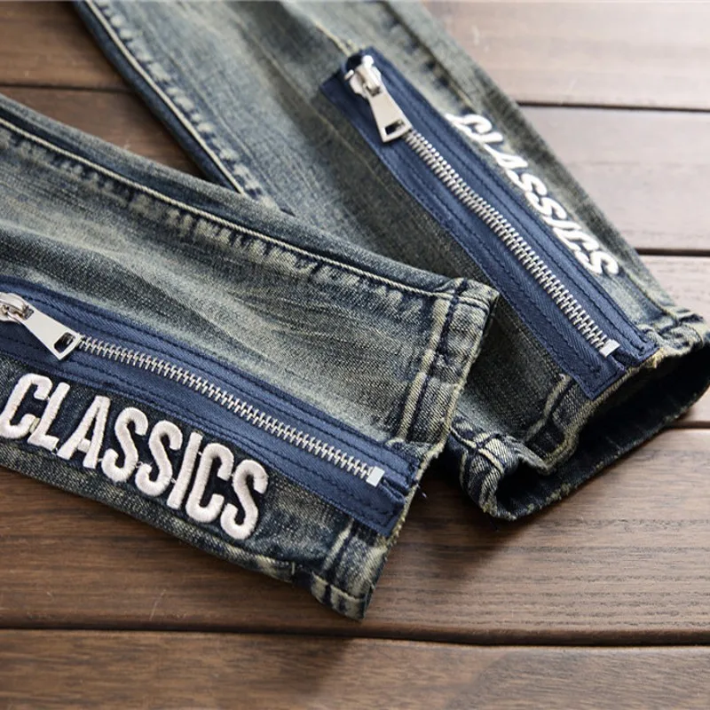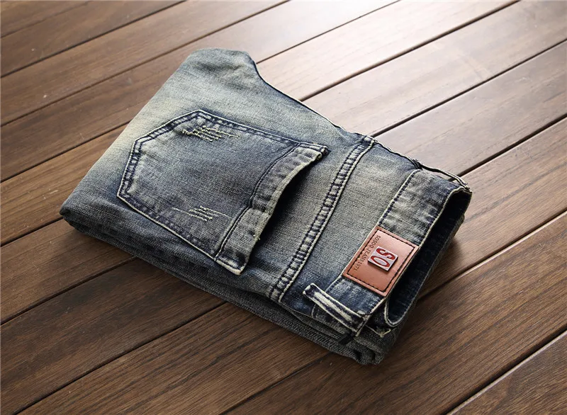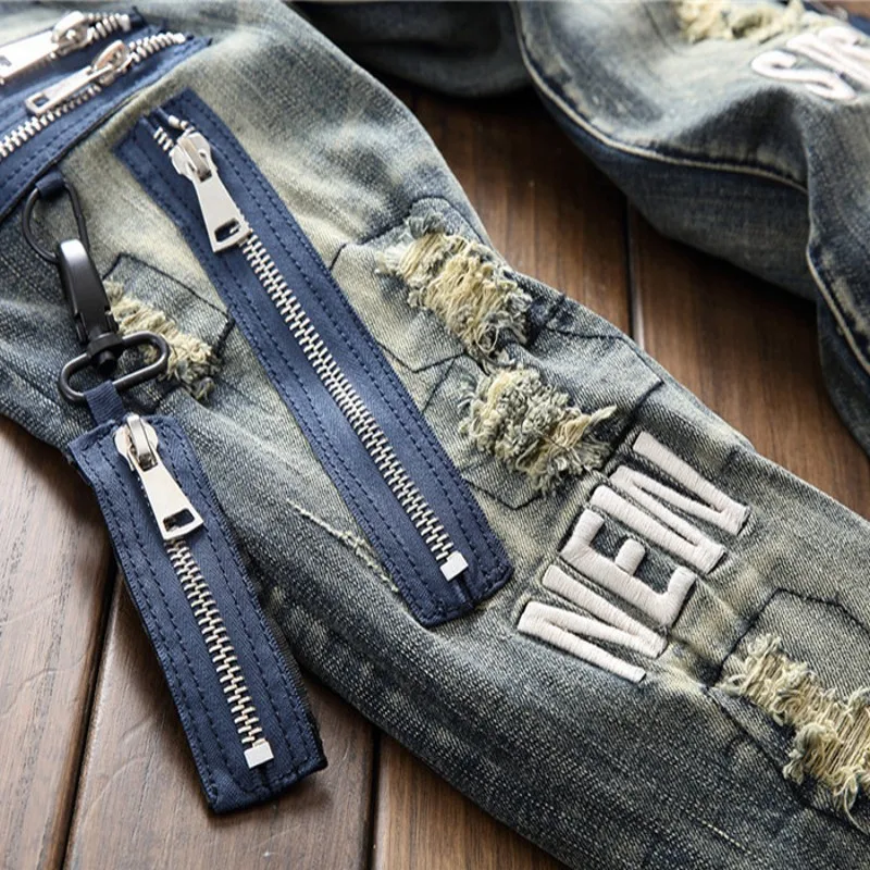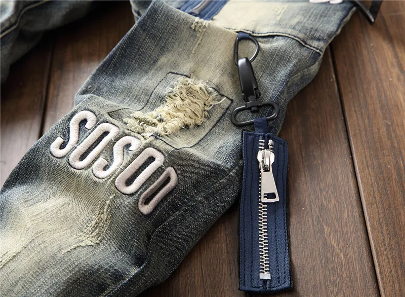 Джинсы мужские рваные с вышивкой, модные Стрейчевые зауженные брюки с разными заплатками, прямые джинсовые штаны с вышивкой