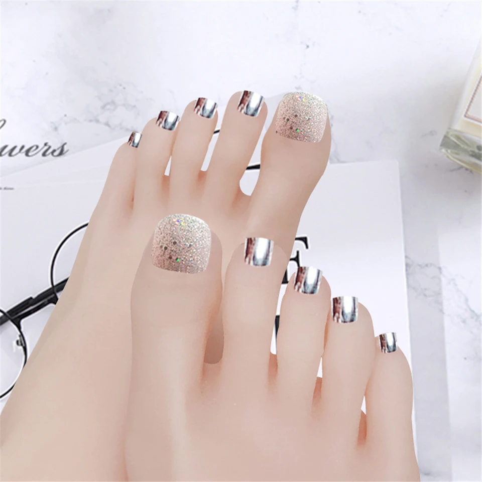 Новинка 2021, 24 шт., искусственные носочки для ногтей, серебристые, красные, высококачественные Стразы, искусственные ногти для ног с клеем, Летние красивые носочки для ногтей
