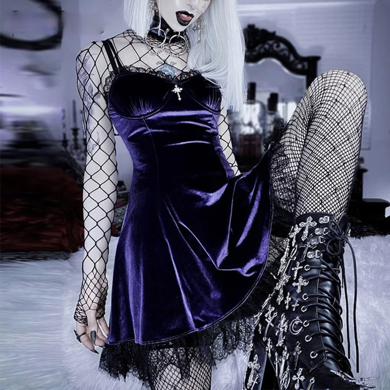 Женское винтажное бархатное платье Goth, фиолетовое ТРАПЕЦИЕВИДНОЕ ПЛАТЬЕ В Стиле Лолита, вечерние нее платье с высокой талией, сексуальное черное платье, одежда