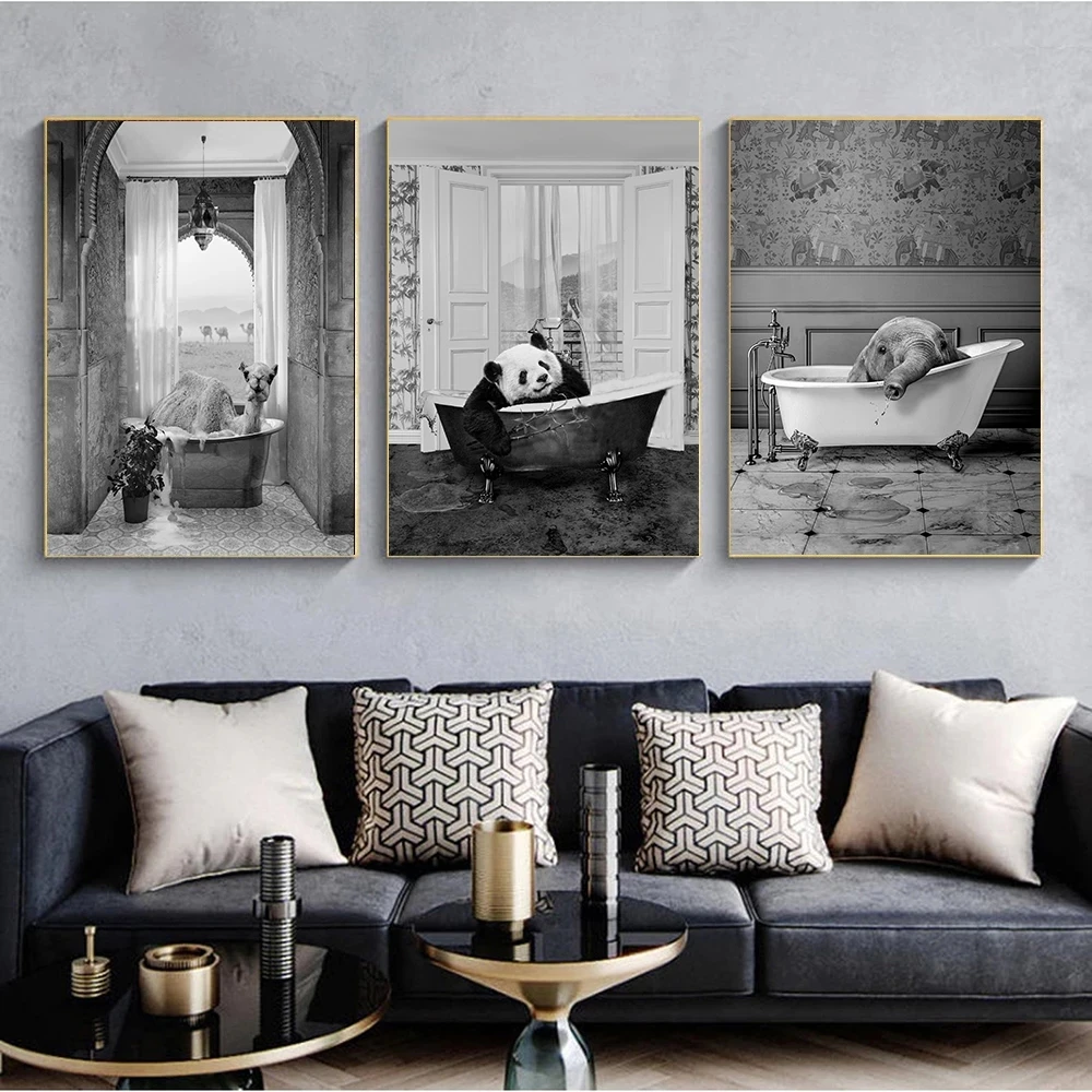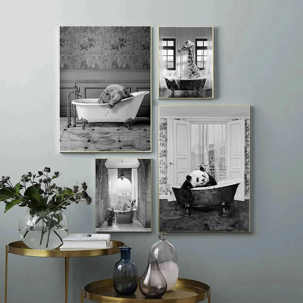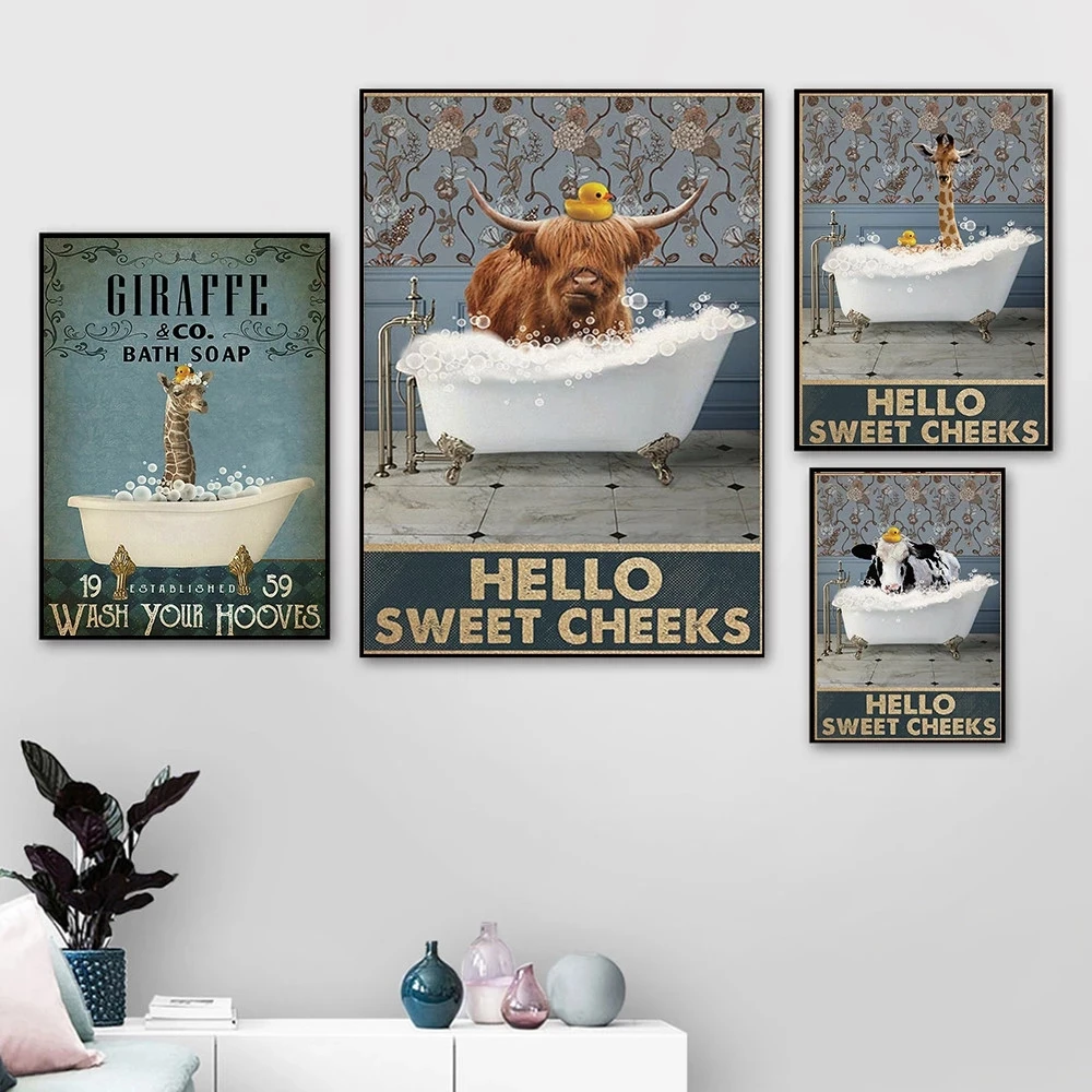 Забавный постер в ванную комнату с изображением крупного рогатого скота, животных, пузырей, ванны, холст, жираф, художественный принт, винтажные милые щеки, милая картина, домашний декор