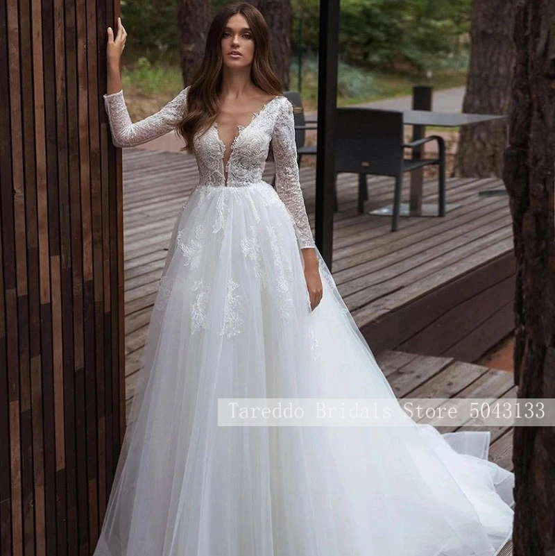 Платье Свадебное Тюлевое с глубоким V-образным вырезом и длинными рукавами