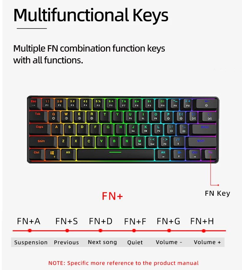 100% новый товар высокого качества.61 механический ключ со стандартным выравниванием покера.Более 100 миллионов нажатий клавиш, в 2 раза дольше, чемТрадиционная механическая ось.Корпус из АБС-пластика, двухцветная крышка для ключей ABS/PBT, Классическая и модная.Водонепроницаемый/пылезащитный/антикоррозионный.3-слойный программируемый режим загрузки (RGB версия).Замечательная сияющая подсветка, 16 миллионов цветов RGB световые эффекты дляОтвечает требованиям геймеров.Настройте заднюю подсветку Вашей Клавиатуры через приложение программного обеспечения.Эргономичный дизайн игровой клавиатуры обеспечивает наиболее удобный игровой опыт.