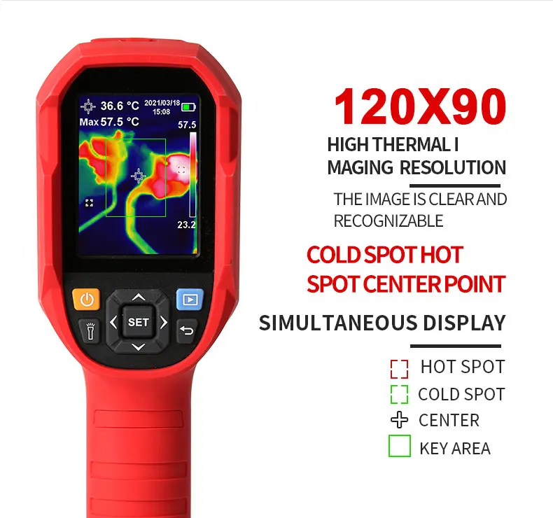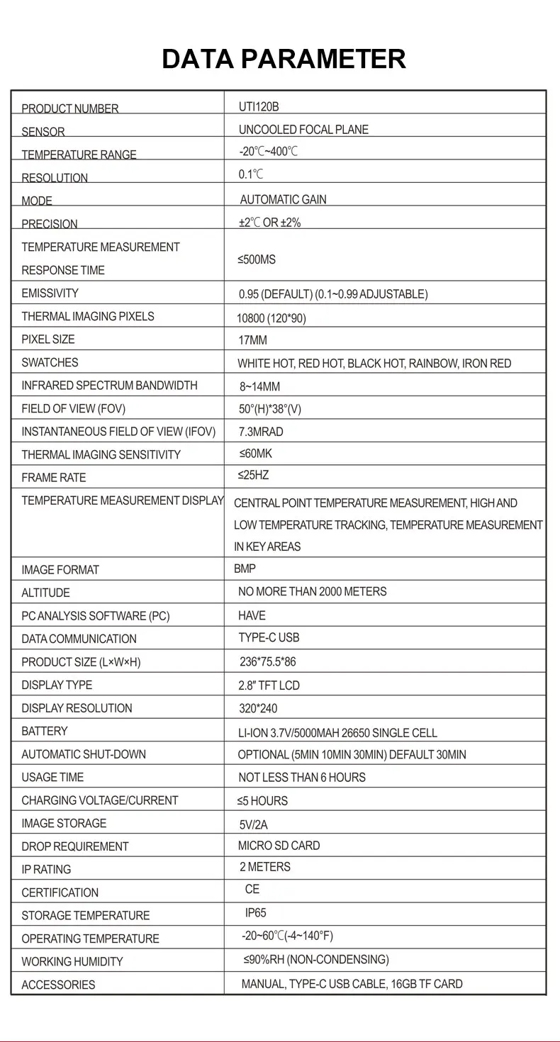 ● Экран TFT 2,8"● Инфракрасное Разрешение: 120x90● Диапазон измерения температуры: -10 ℃ ~ 400 ℃● Функция фотосъемки с памятью для SD-карты● Программное обеспечение для анализа ПК● Зуммер/световой сигнал● Передача изображения в реальном времени● Автоматический захват высокой/низкой температуры● Фонарик● Монтажное отверстие для штатива 1/4"● IP65/2m защита от падения