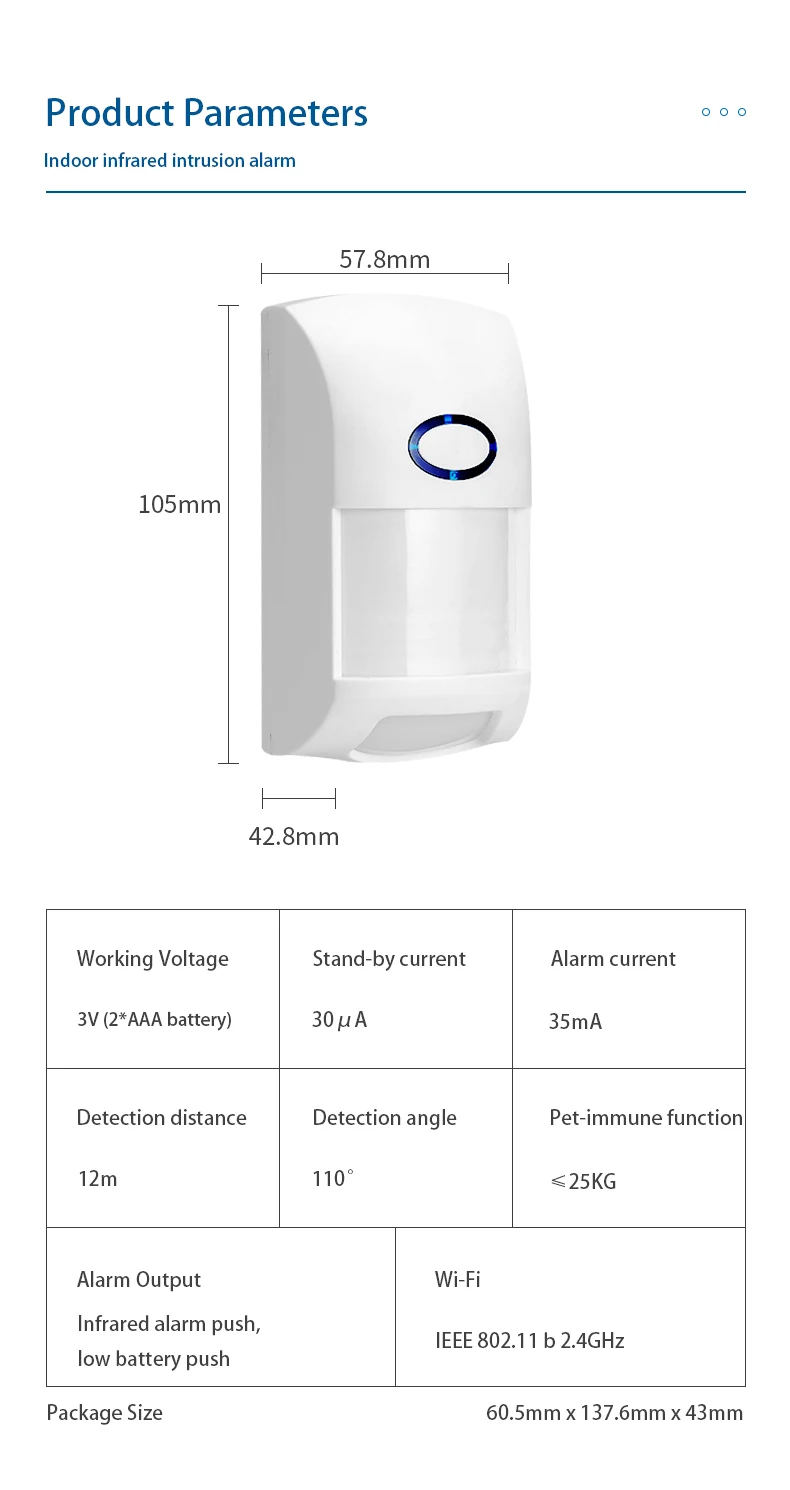 Стенд-по току 3μAТок тревоги 35мАРасстояние обнаружения 12 мУгол обнаружения 110 °ПЭТ-иммунный функционал ≤ 25 кгСигнал тревоги на выходе инфракрасный сигнал тревоги, низкий заряд батареиWi-Fi IEEE802.11 b 2.4GH