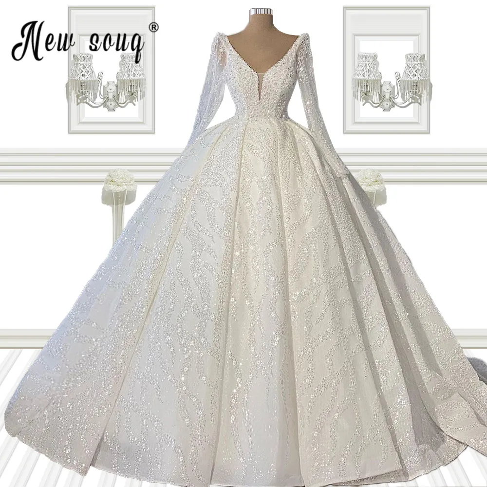 Цельное свадебное платье с бусинами и V-образным вырезом, с длинным рукавом, 2021, великолепное бальное платье, свадебное платье, свадебные платья