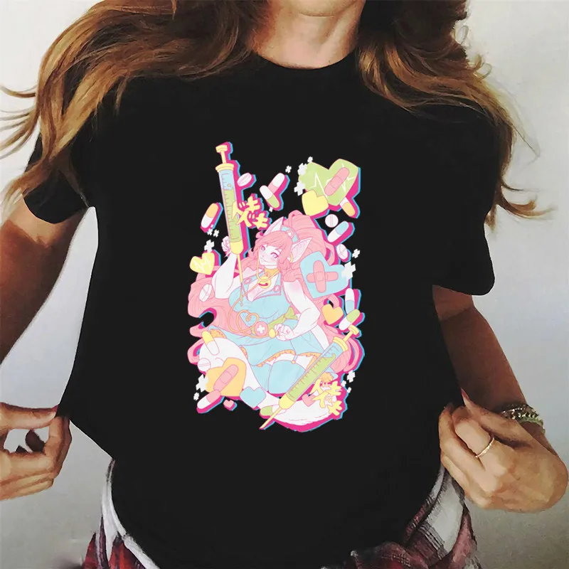 Футболка женская Свободная с коротким рукавом, милая мультяшная рубашка в стиле Харадзюку с принтом медсестры и девушки, топ с графическим принтом, на лето