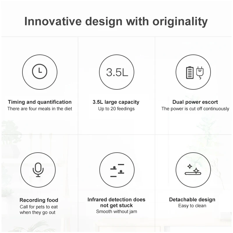 Автоматическая кормушка для домашних животных изготовлена из импортированных экологически безопасных материалов ABS, нетоксичных и пищевых.