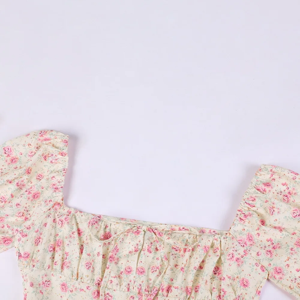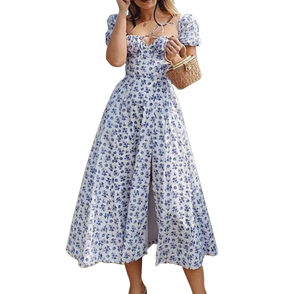 Платье женское летнее длинное с коротким рукавом-фонариком и рюшами
