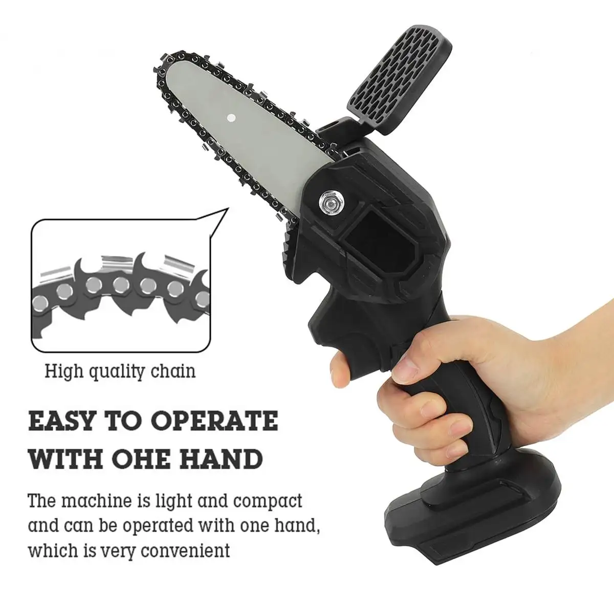Особенность:-Литиевый аккумулятор большой емкости. Технология литиевого аккумулятора, защита от перегрузки аккумулятора, быстрая зарядка.-Двигатель с медным сердечником. Высокая мощность, быстрый сбор энергии, высокая выходная мощность.-Высококачественная направляющая цепь. Острая и износостойкая, глубокая закалка, более износостойкая и гладкая резка.-Эргономичная ручка, удобная и безопасная для переноски.-Ручка имеет нескользящую конструкцию, ее очень удобно держать в руке.-Безопасность пиления, эффективное повышение эффективности вашей работы.-Бесступенчатая скорость, более детальная обрезка, лучшая защита деревьев.
