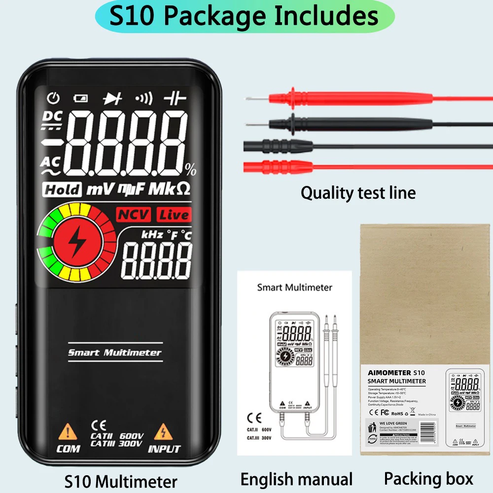 Ручной цифровой мультиметр BSIDE 3,5 дюйма S10, 9999 отсчетов, интеллектуальный тестер напряжения постоянного и переменного тока, конденсатор температуры, омматический диод, Бесконтактный индикатор напряжения, Гц