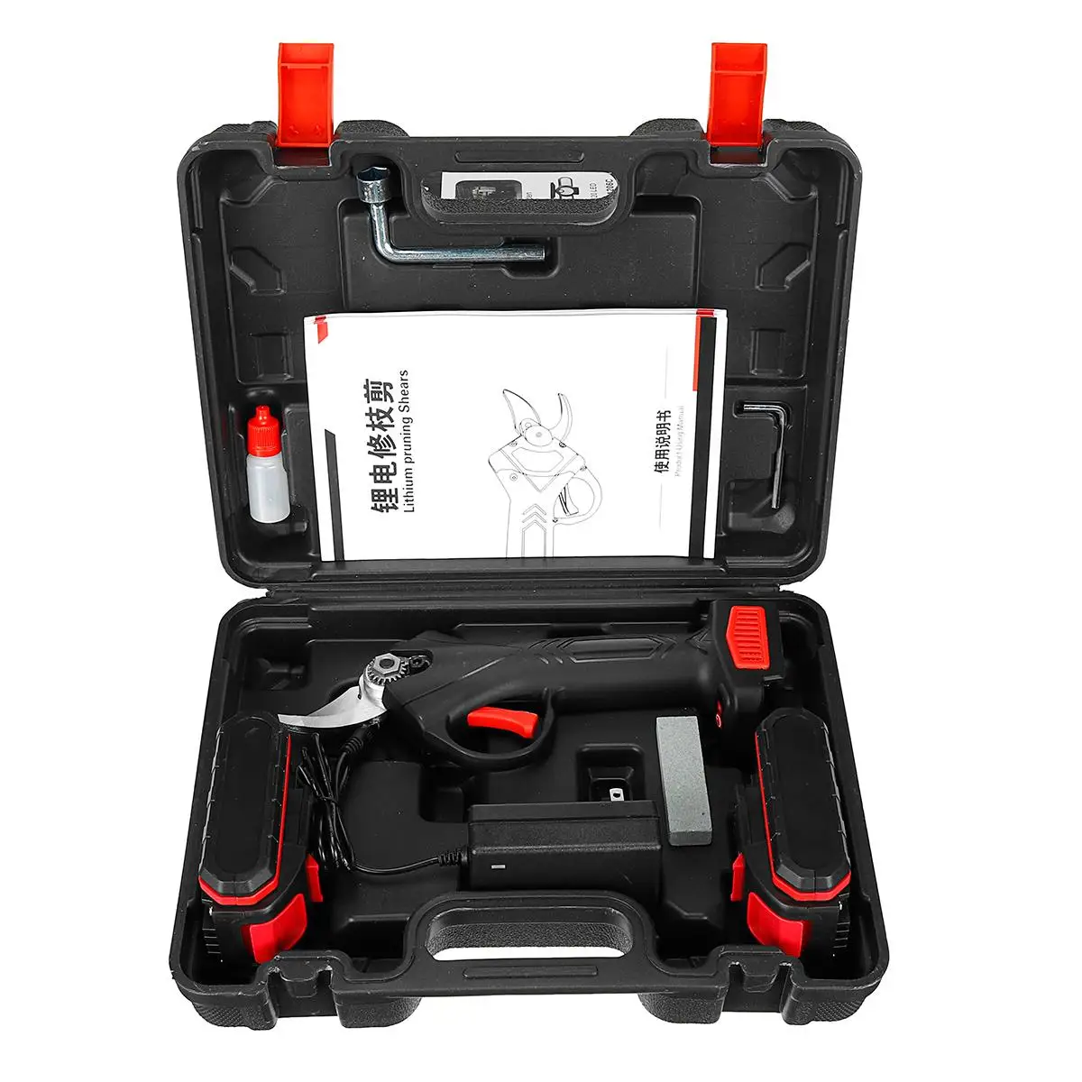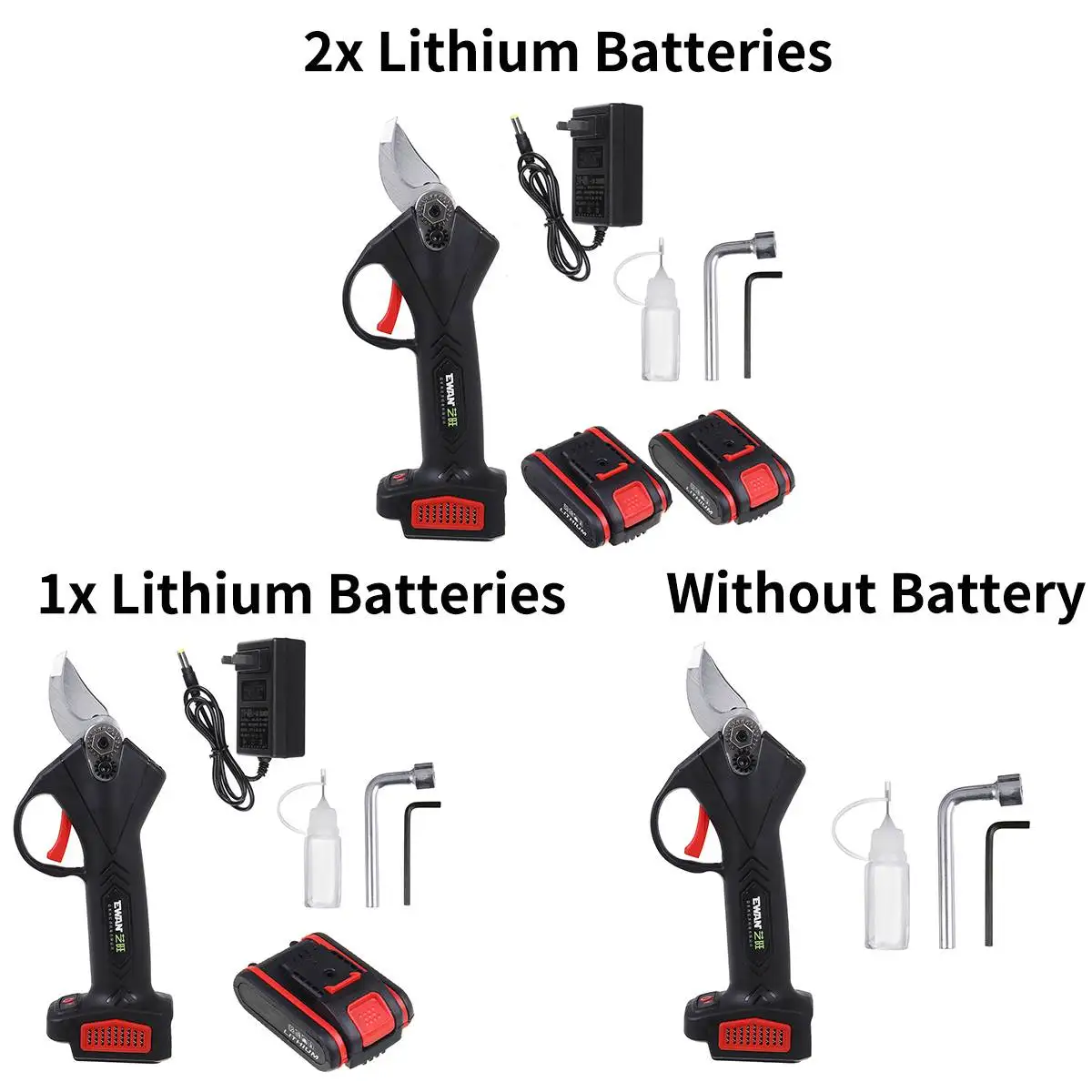 Упаковка включает:1 * Электрический секатор1 * зарядный адаптер (вилка стандарта США)1 * Руководство пользователя2x литиевые батареи/1x литиевая батарея/без батареи (опционально)