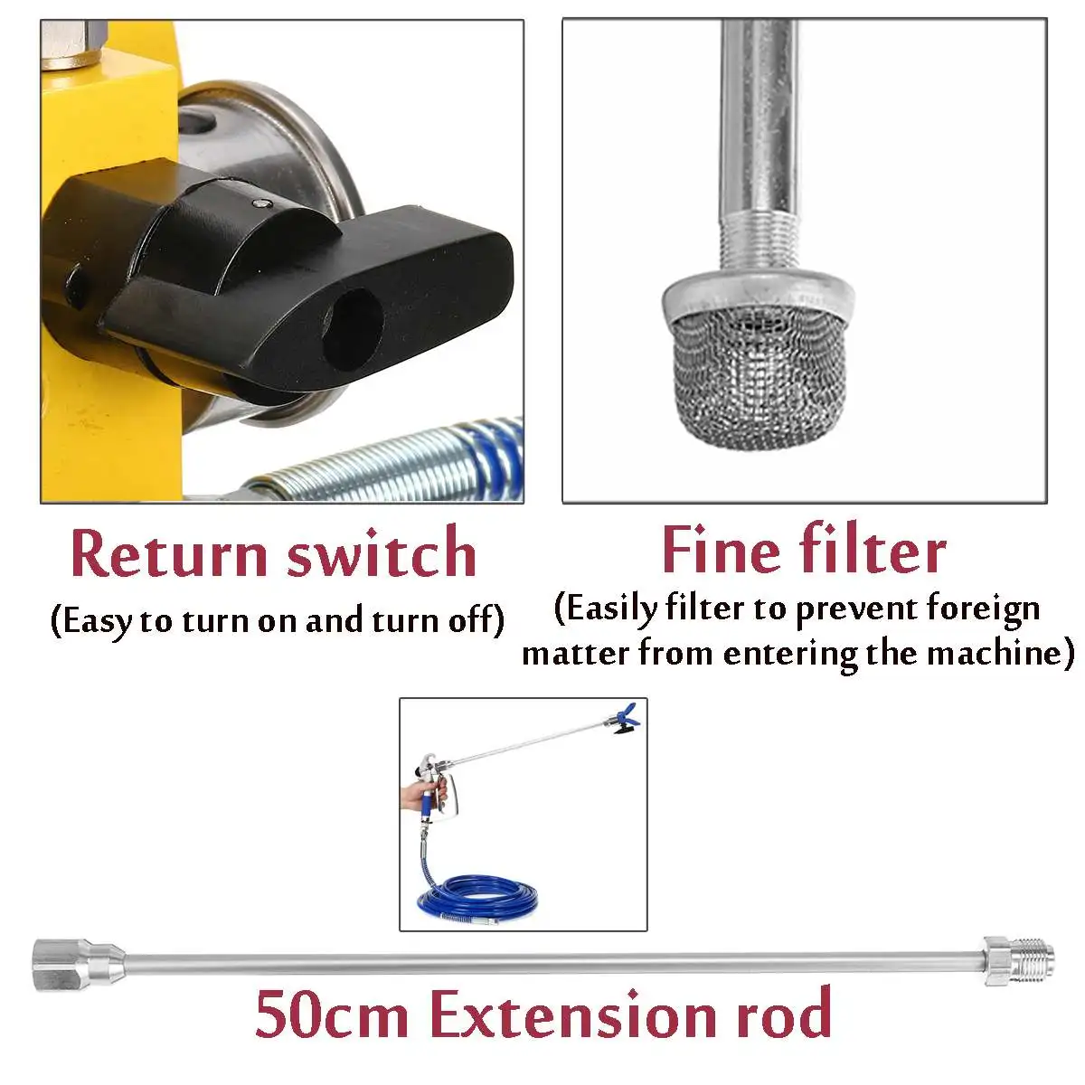 Примечание:-Пожалуйста, убедитесь, что спецификации вилки источника питания во избежание взрыва, вызванного неподходящим напряжением.-Покрытия, краски, клеи, эмульсионные краски, коррозионные краски или другие без крупных частиц, которые могут быть использованы. И частицы не могут быть использованы.-Разбавитель представляет собой комбинацию различных органических соединений, включая бензол, толуол, бутиловый эфир, формальдегид и другие вещества. Это своего рода жидкость, которая разбавляет краску, это очень волатильная, не используйте ее в ограниченном пространстве.-Установка распылителя: Пожалуйста, обратите внимание на дугу прокладки, чтобы она соответствовала дуге дуги.-Перед загрузкой всасывающей трубы обязательно проткните отверткой, независимо от того, движется ли стальной шарик в нижней части корпуса насоса.-У нас есть видео установки, пожалуйста, свяжитесь с нами, если вам нужно.