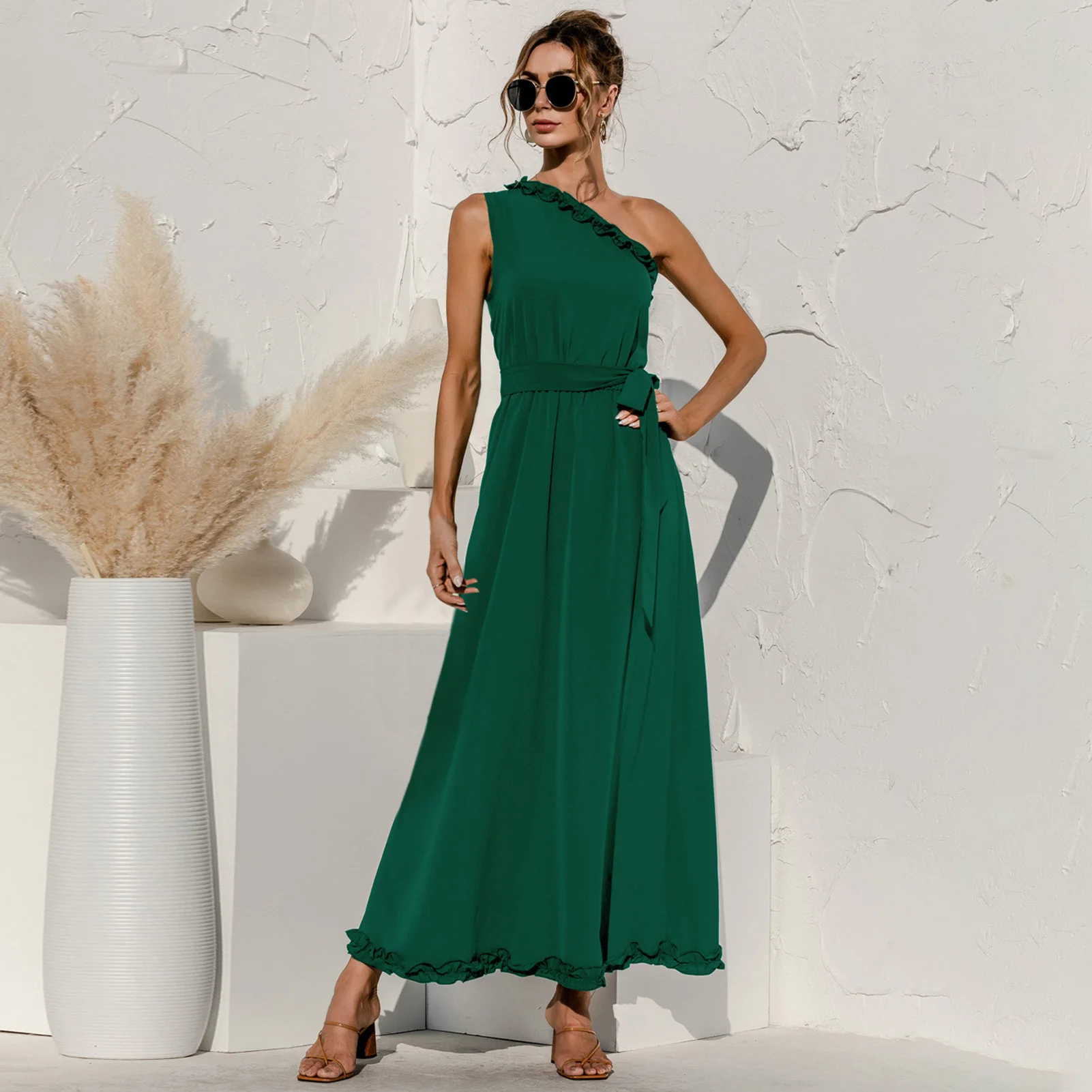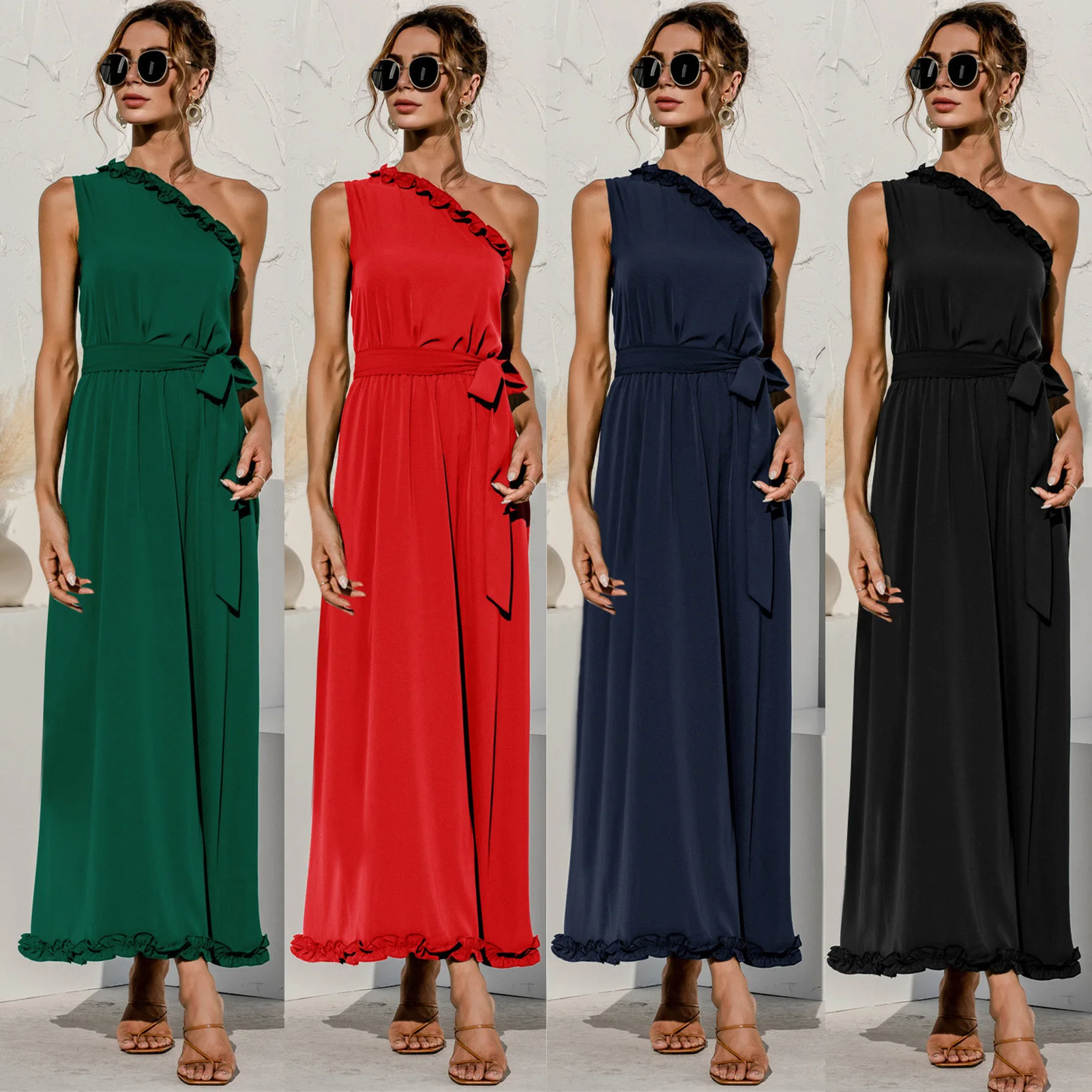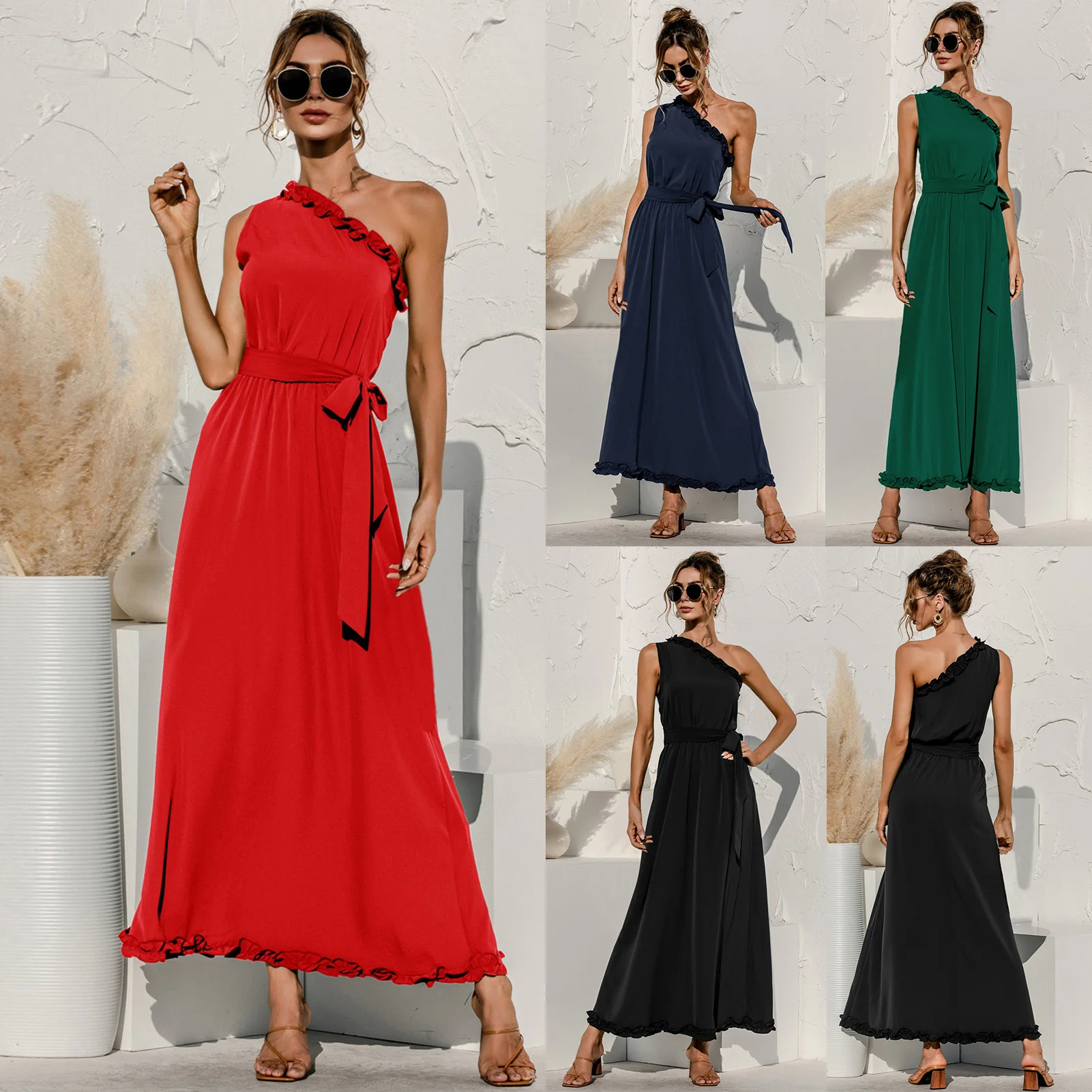 Женское платье макси в стиле бохо, красное сексуальное платье на одно плечо, с оборками, с завязкой на талии, летнее праздничное платье без рукавов