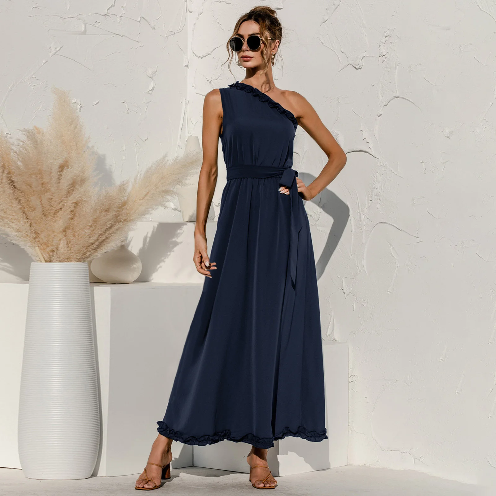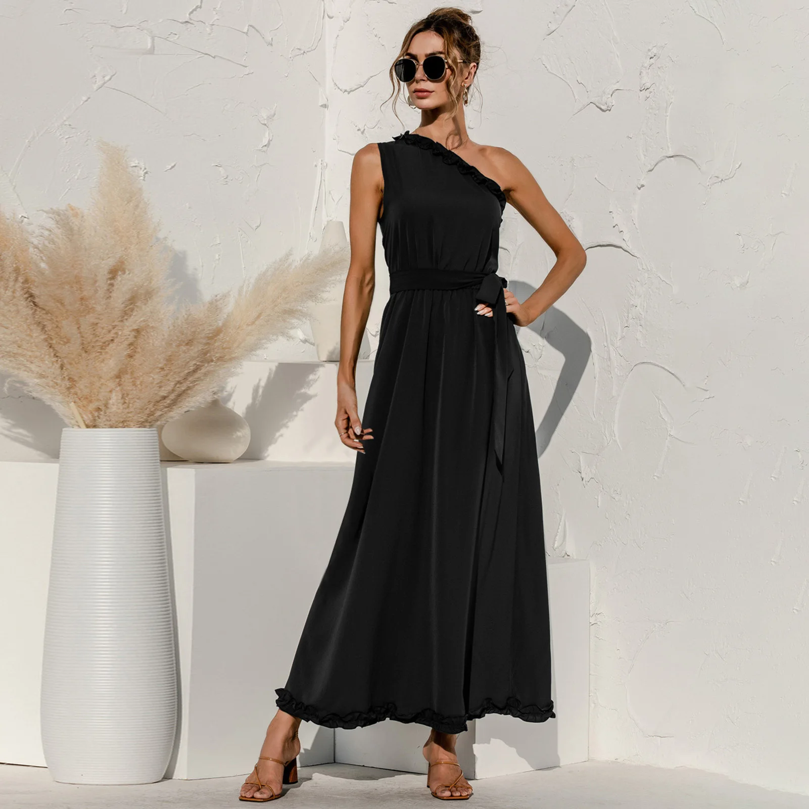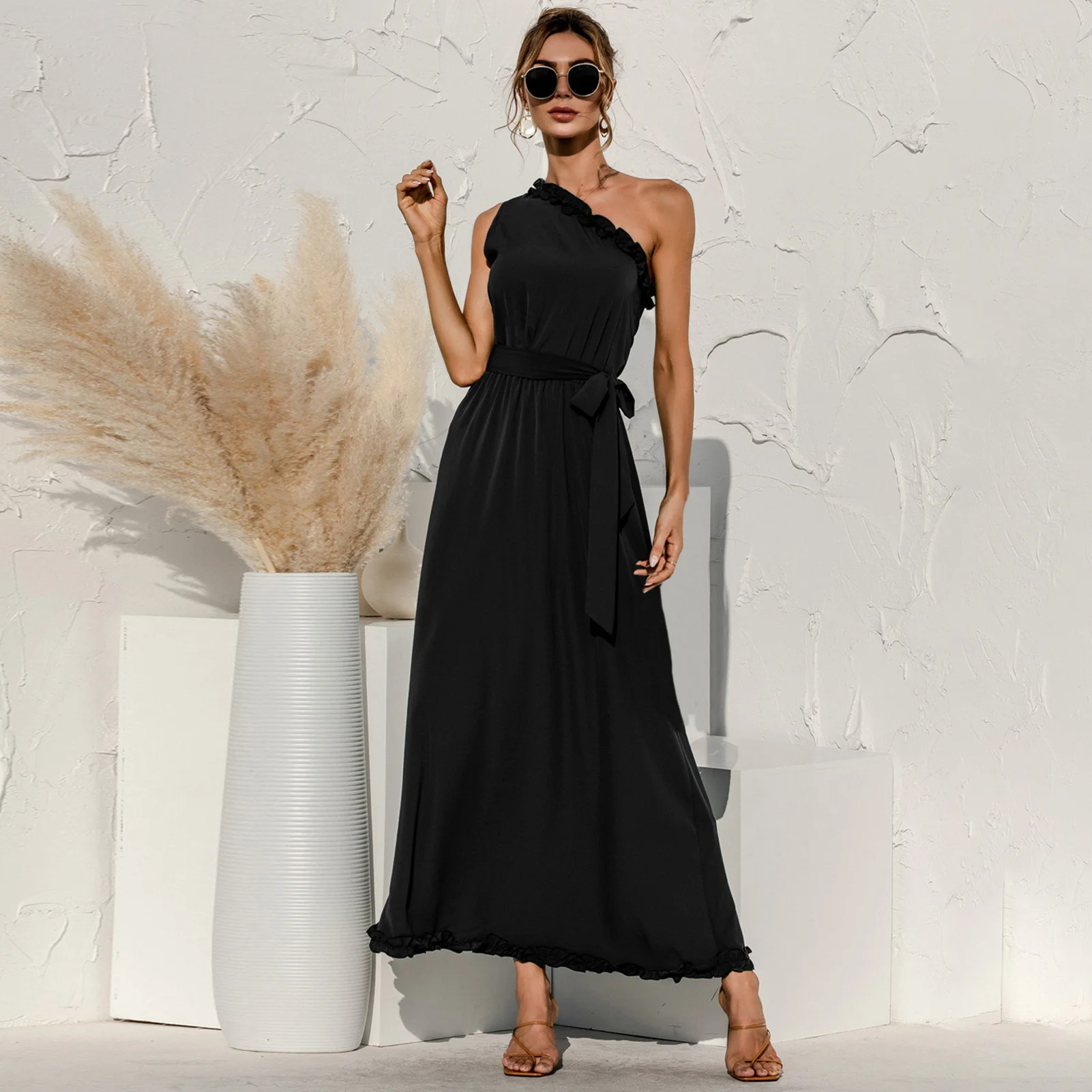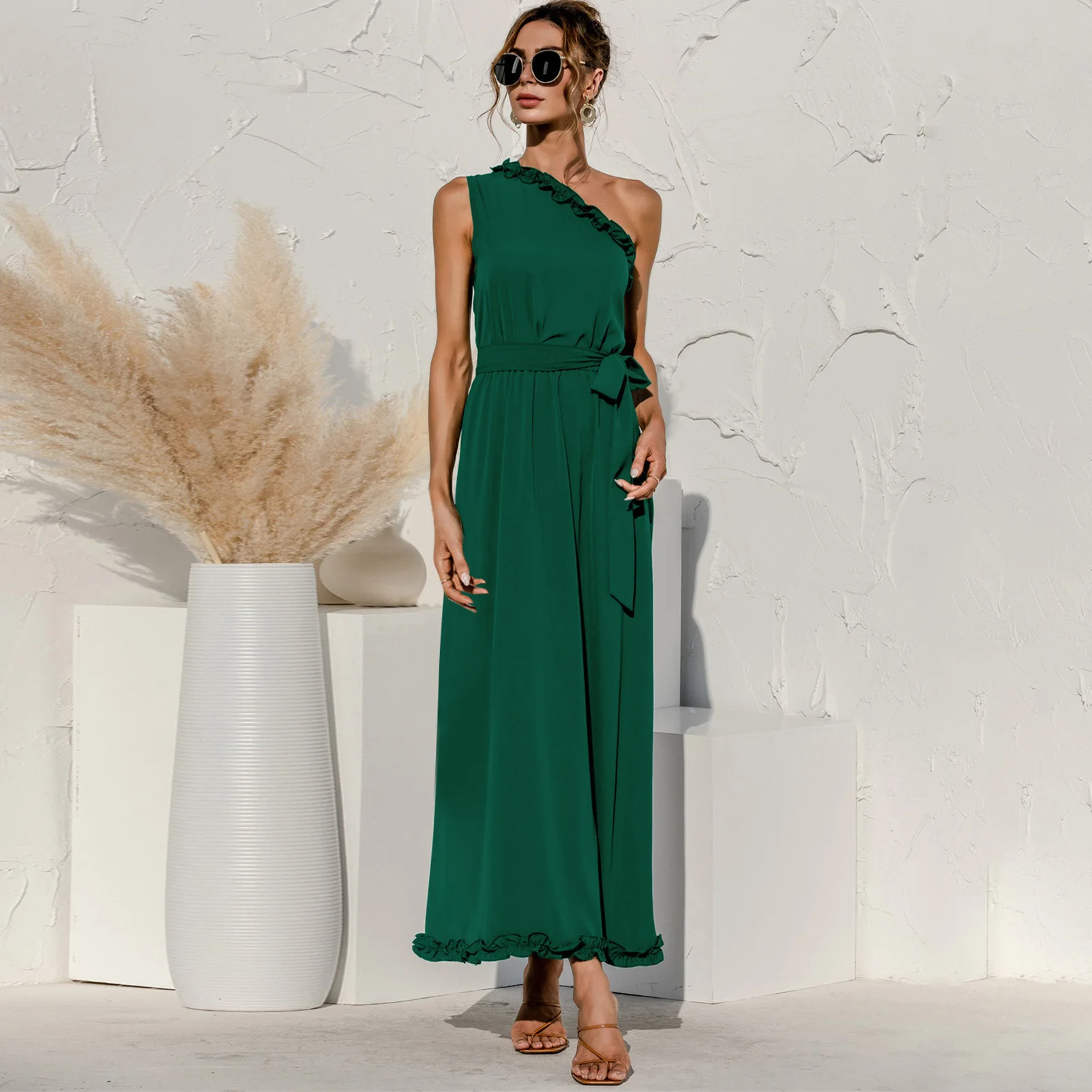 Женское платье макси в стиле бохо, красное сексуальное платье на одно плечо, с оборками, с завязкой на талии, летнее праздничное платье без рукавов