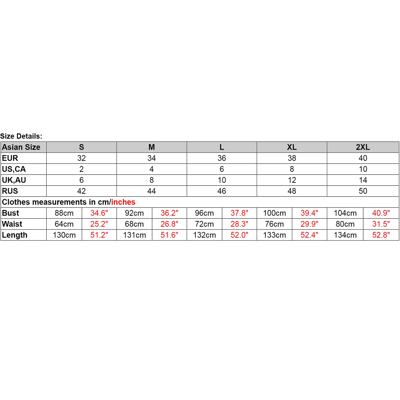Азиатский размер S М L XL 2XL EUR 32 34 36 38 40 США, CA 2 4 6 8 10 Великобритания, Австралия 6 8 10 12 14 Рус 42 44 46 48 50 Размеры одежды в см/дюймах Бюст 88 см 34,6" 92 см 36,2" 96 см 37,8" 100 см 39,4" 104 см 40,9" Талия 64 см 25,2" 68 см 26,8" 72 см 28,3" 76 см 29,9" 80 см 31,5" Длина 130 см 51,2" 131 см 51,6" 132 см 52,0" 133 см 52,4" 134 см 52,8" Как измерить: Примечание: 1. Эта информация о размерах одежды предназначена только для справки, пожалуйста, проверьте приведенные выше подробные измерения, чтобы выбрать правильный размер, и допускается погрешность в 1-2 см (0,4-0,8 ") из-за ручного измерения, спасибо. 2. Цвет товара, отображаемый на фотографиях, может слегка отличаться на мониторе вашего компьютера, так как мониторы откалиброваны не одинаково. Посылка тация: 1 * женское платье