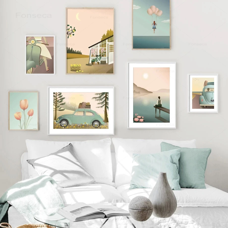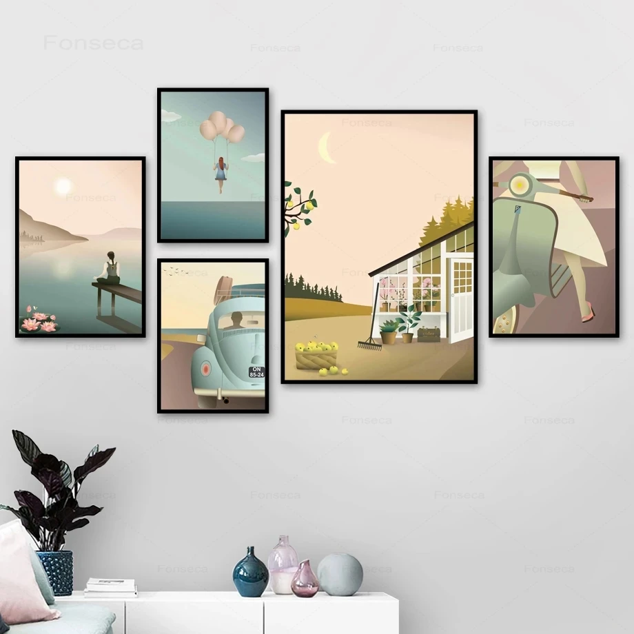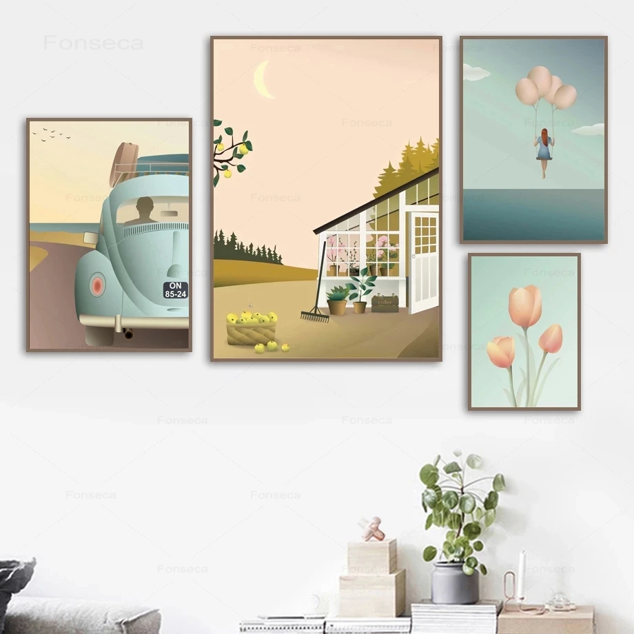 Скандинавский мультяшный пейзаж, настенная Картина на холсте, абстрактный автомобиль, дерево, Йога, девушка, иллюстрации, плакаты для украшения гостиной