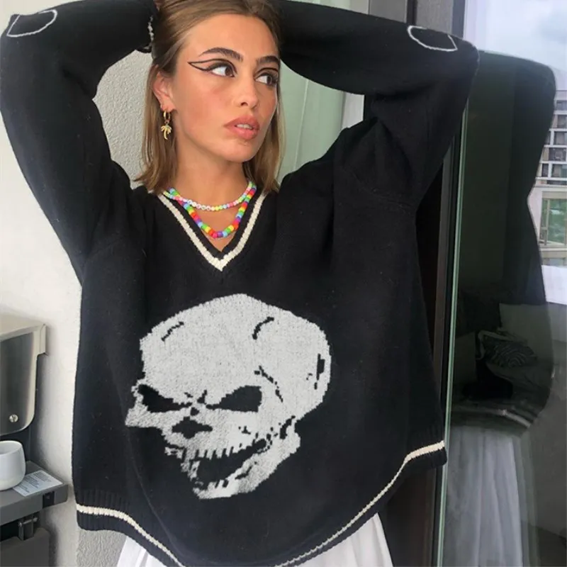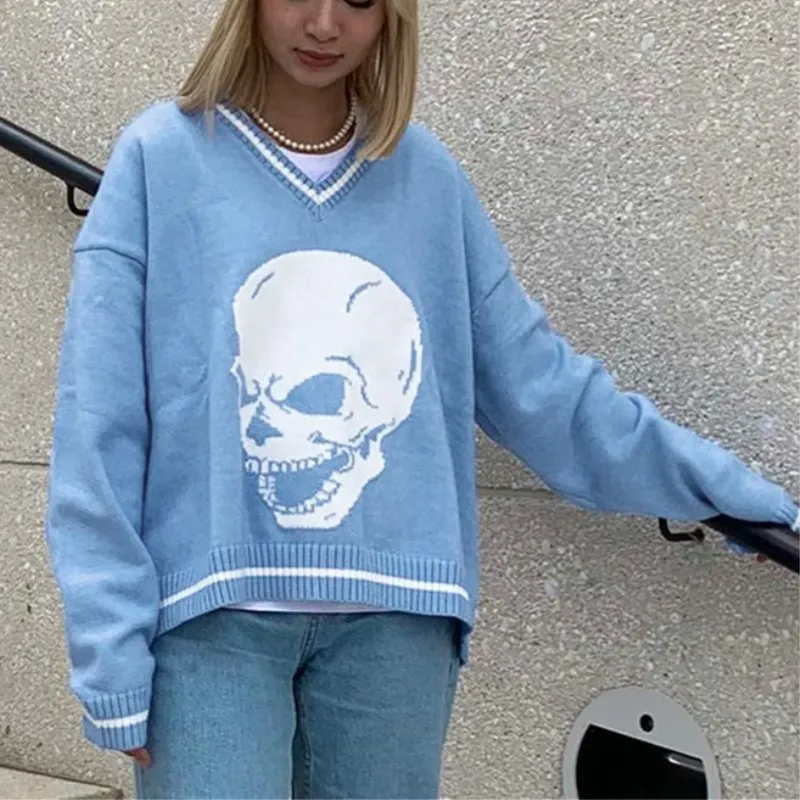 Женский Осенний пуловер Y2k, повседневный синий топ с принтом скелета и V-образным вырезом, в стиле Харадзюку, 2021