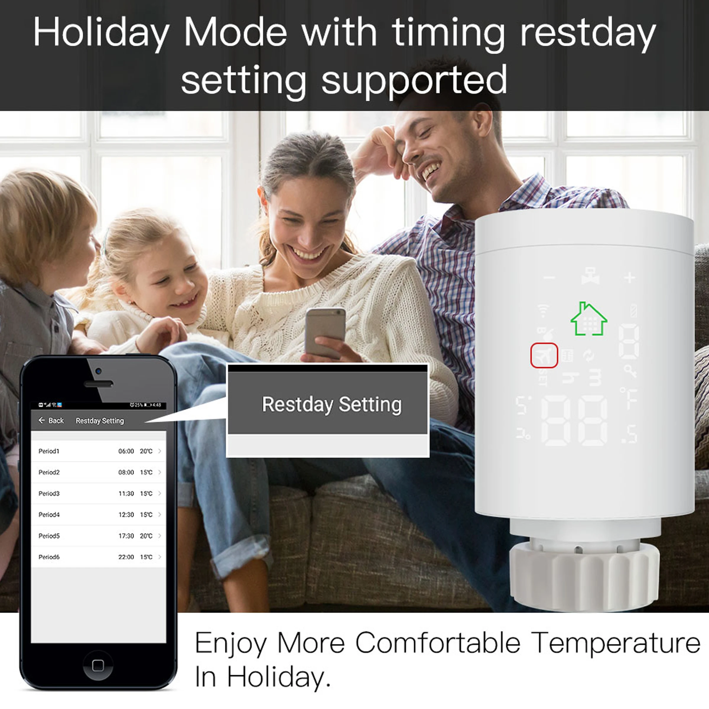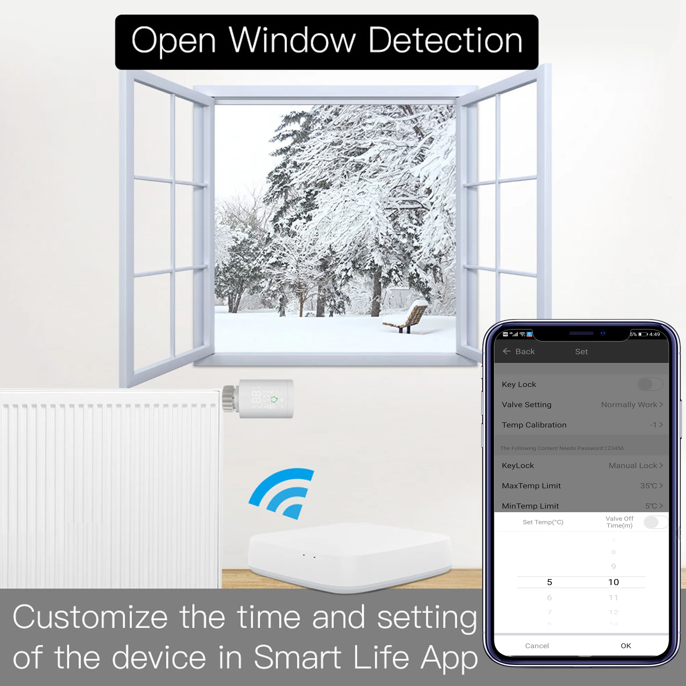 5. Обнаружение открытого окна: когда температура в помещении внезапно падает в темп. Порог, клапан закроется на 15 минут. После этого, если температура в комнате. По-прежнему ниже температуры. Этот режим будет сохранен. Кроме того, цифровой дисплей легко читается с температурой Цельсия.