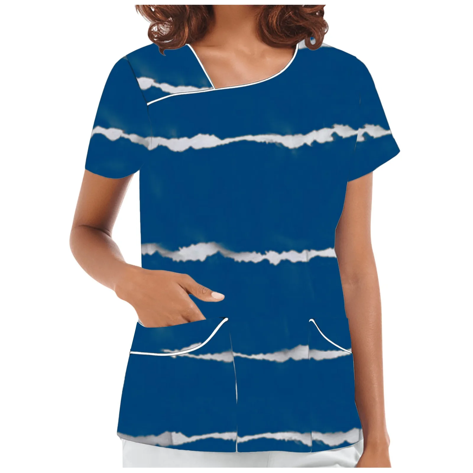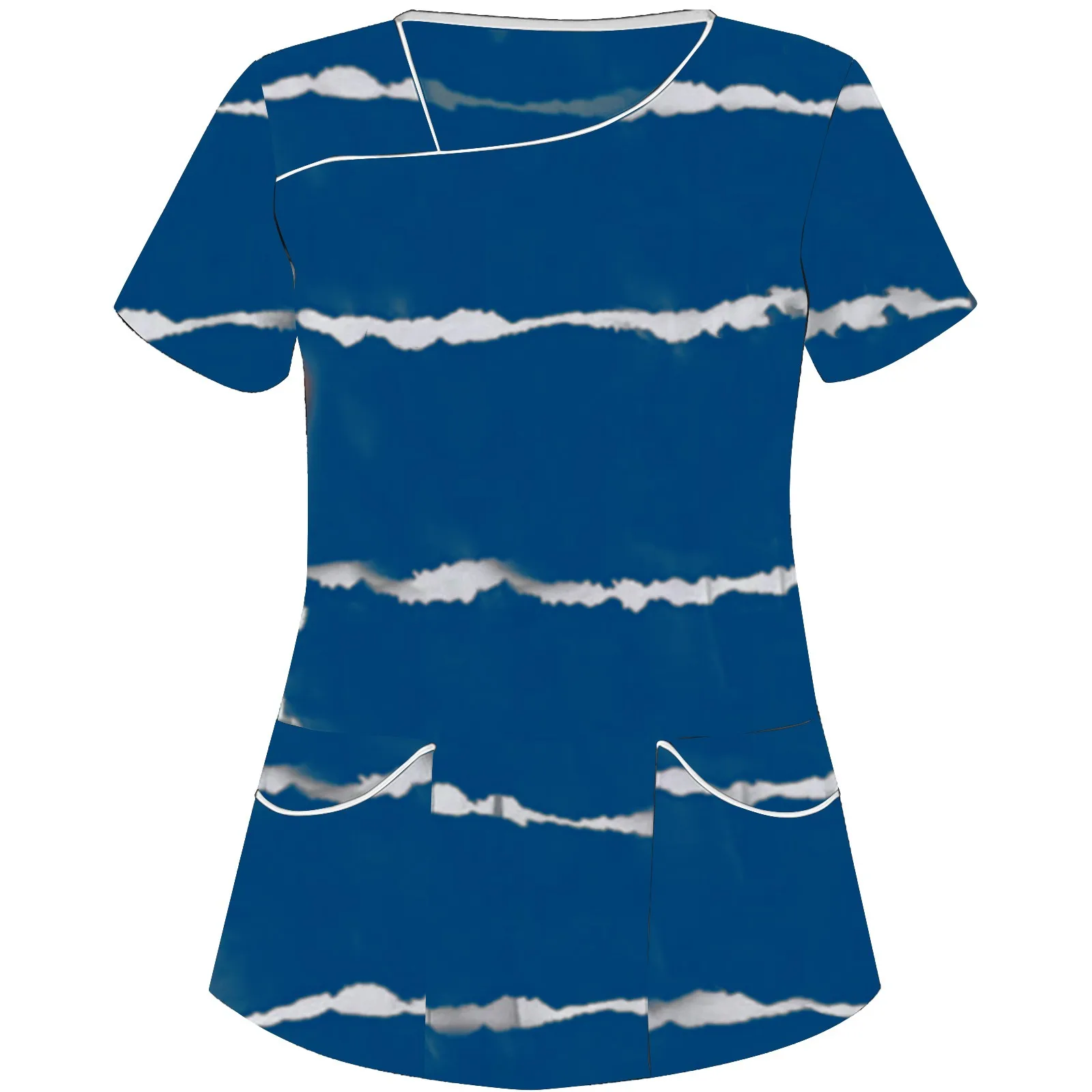 Полосатая Рабочая форма Asym-шеи уход медсестры Топы карманная блузка короткий рукав печать рабочая одежда медсестры клиника спа-одежда A50