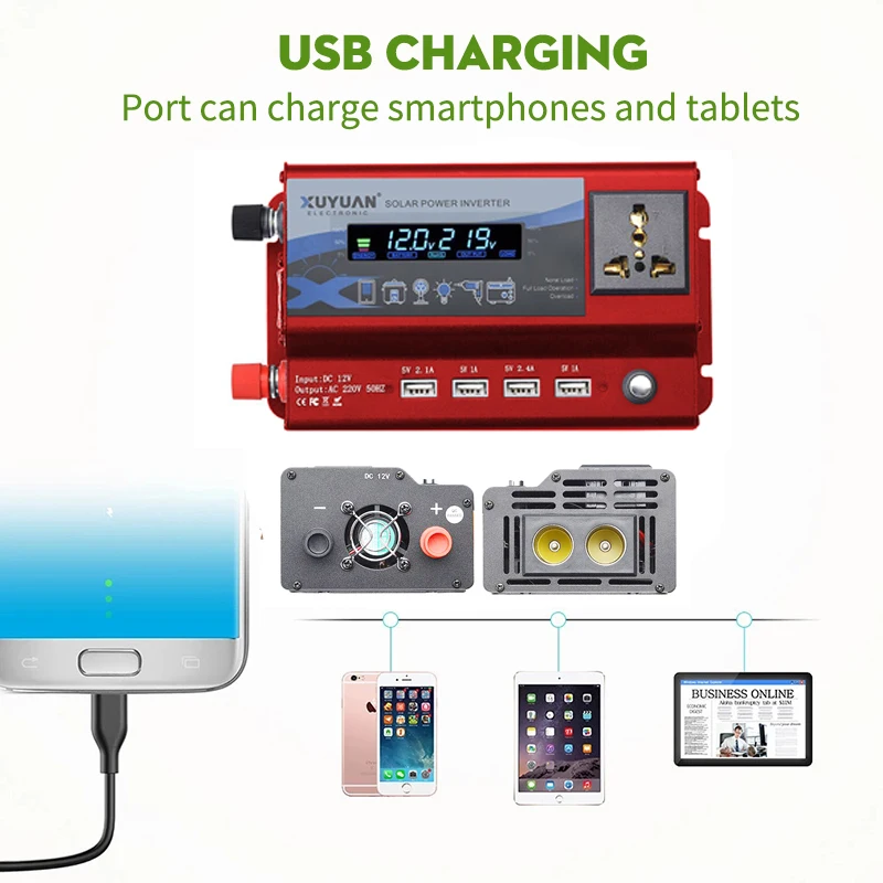 ● Инвертор мощности (1200 Вт)1. Преобразуйте 12 В постоянного тока в 110 В переменного тока.2. Переключатель ВКЛ/ВЫКЛ контролирует вентилятор3. Автоматическое выключение тепла4. Дополнительная емкость от перенапряжения5. Широко используется для всех видов электрического оборудования, потребляемая мощность которого равна напряжению переменного тока 220 В, таких как мобильный телефон, ноутбук, электрический светильник, цифровая камера, видеофон, телевизор, CD-плеер, DVD, электрический вентилятор, электрические инструменты и так далее.6. Безопасная конструкция зарядки защищает ваши устройства от чрезмерного тока, перегрева, короткого замыкания и перезарядкиВстроенный вентилятор охлаждения помогает уменьшить тепло7. Корпус из алюминиевого сплава, антиоксидантный, прочный, модный и прочный8. Непосредственно Подключите к автомобильному прикуривателю или аккумулятору, удобно использовать9. Идеально подходит для использования в автомобиле для отдыха, работы и кемпинга
