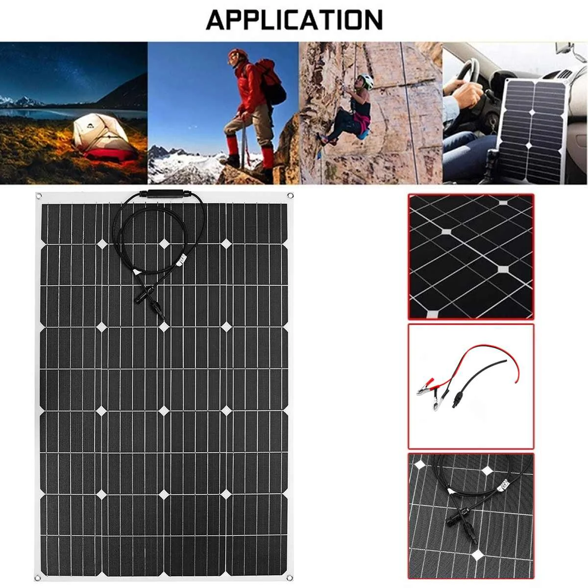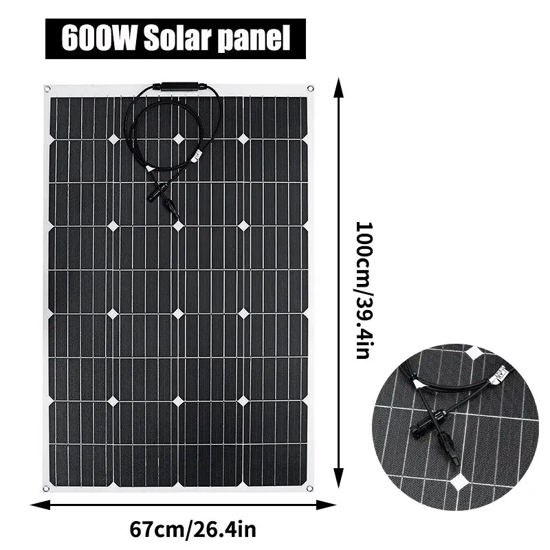 Особенности:● Гибкие солнечные панели (600 Вт)-Высокая мощность, подходит для улицы и RV-- ЭТФЭ передней панели, гибкие, светильник и прочный, светильник вес-Эффективность монокристаллических кремниевых солнечных элементов составляет 24-26%.-- 4x люверсов более удобны в установке.-Водонепроницаемый IP65 класс, подходит для использования на открытом воздухе под дождем. Светильник-Подходит для кемперов, лодок, домов, садов, сараев или ферм