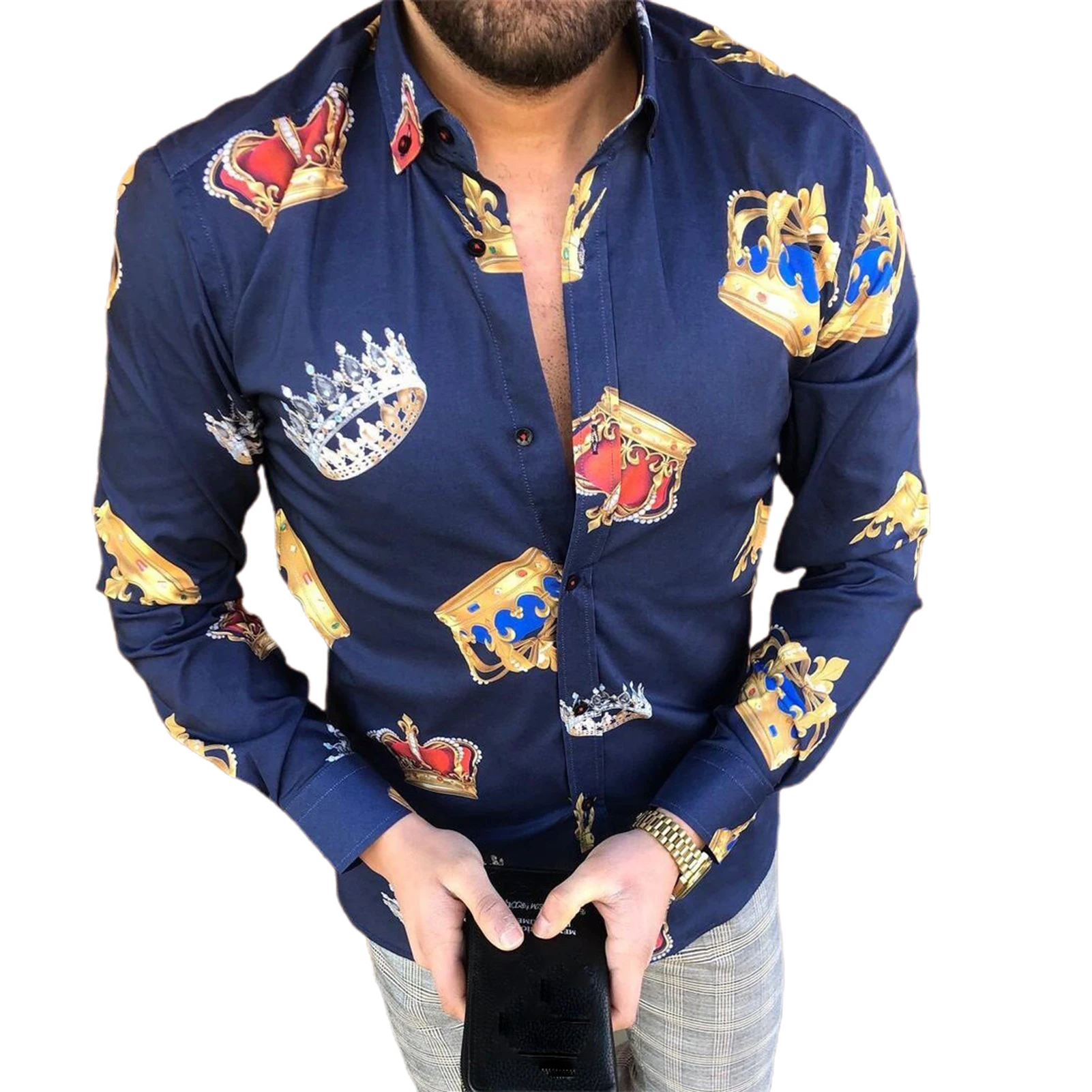 Роскошные Рубашки с принтом короны для мужчин; Коллекция 2021 года; Сезон весна; Приталенная Повседневная рубашка с длинными рукавами; Уличная одежда; Вечерние рубашки; Camisa Masculina