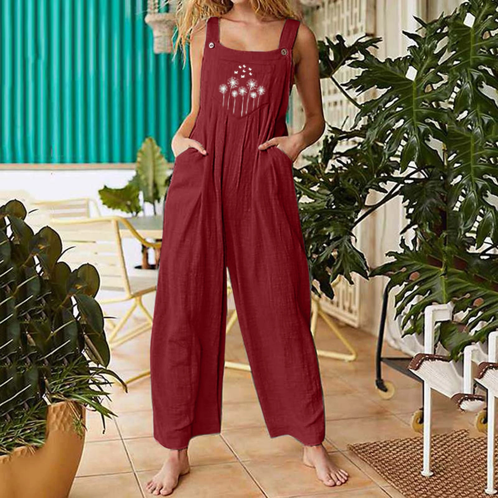 2021 Летний Новый женский комбинезон, однотонный Свободный Длинный Простой комбинезон без рукавов с принтом одуванчика, Свободный комбинезон