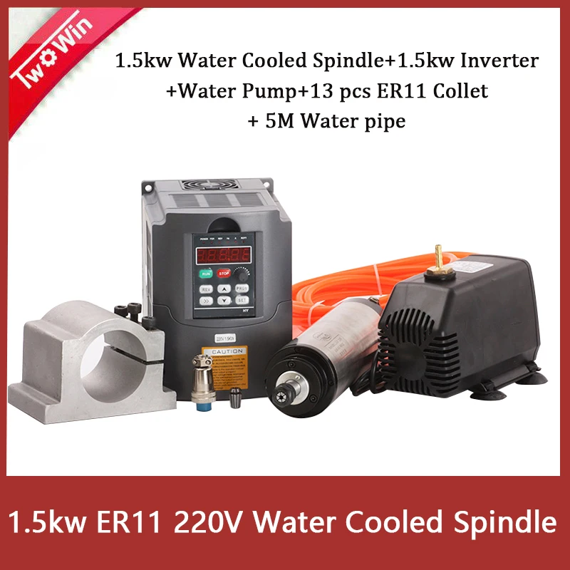 Двигатель шпинделя 1,5 кВт, шпиндель с водяным охлаждением, 1,5 кВт VFD, зажим 65 мм, водяной насос охлаждения и 13 шт. ER11 для фрезерного станка с ЧПУ